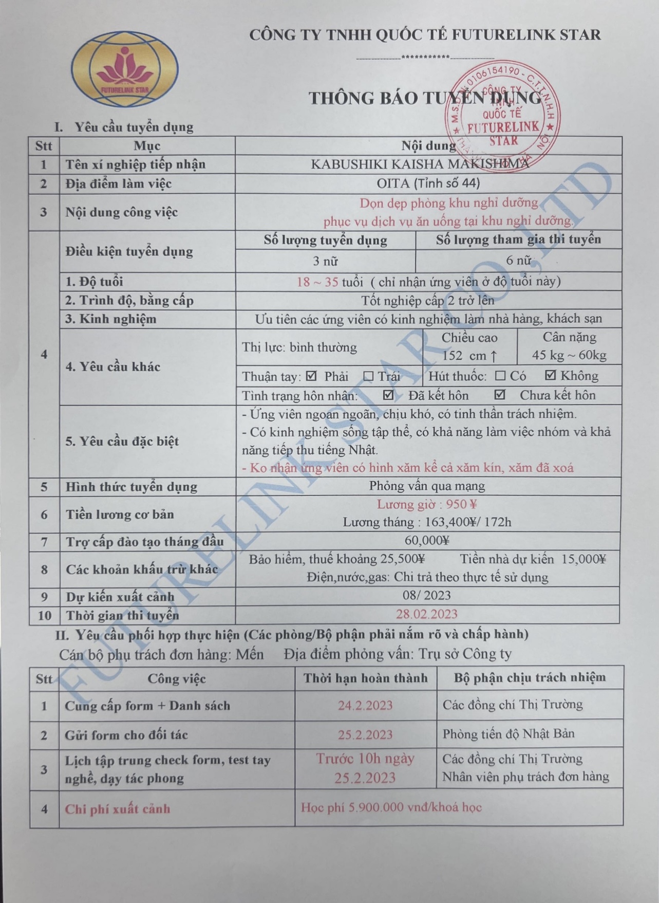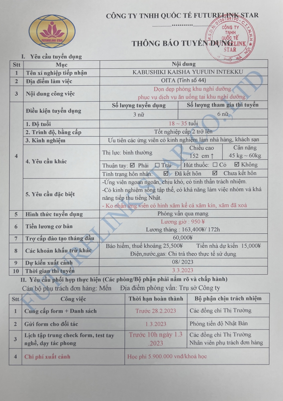 1.TUYỂN 3 NỮ VỆ SINH KHÁCH SẠN TỈNH OITA, LƯƠNG THÁNG 163,400 YÊN/THÁNG.