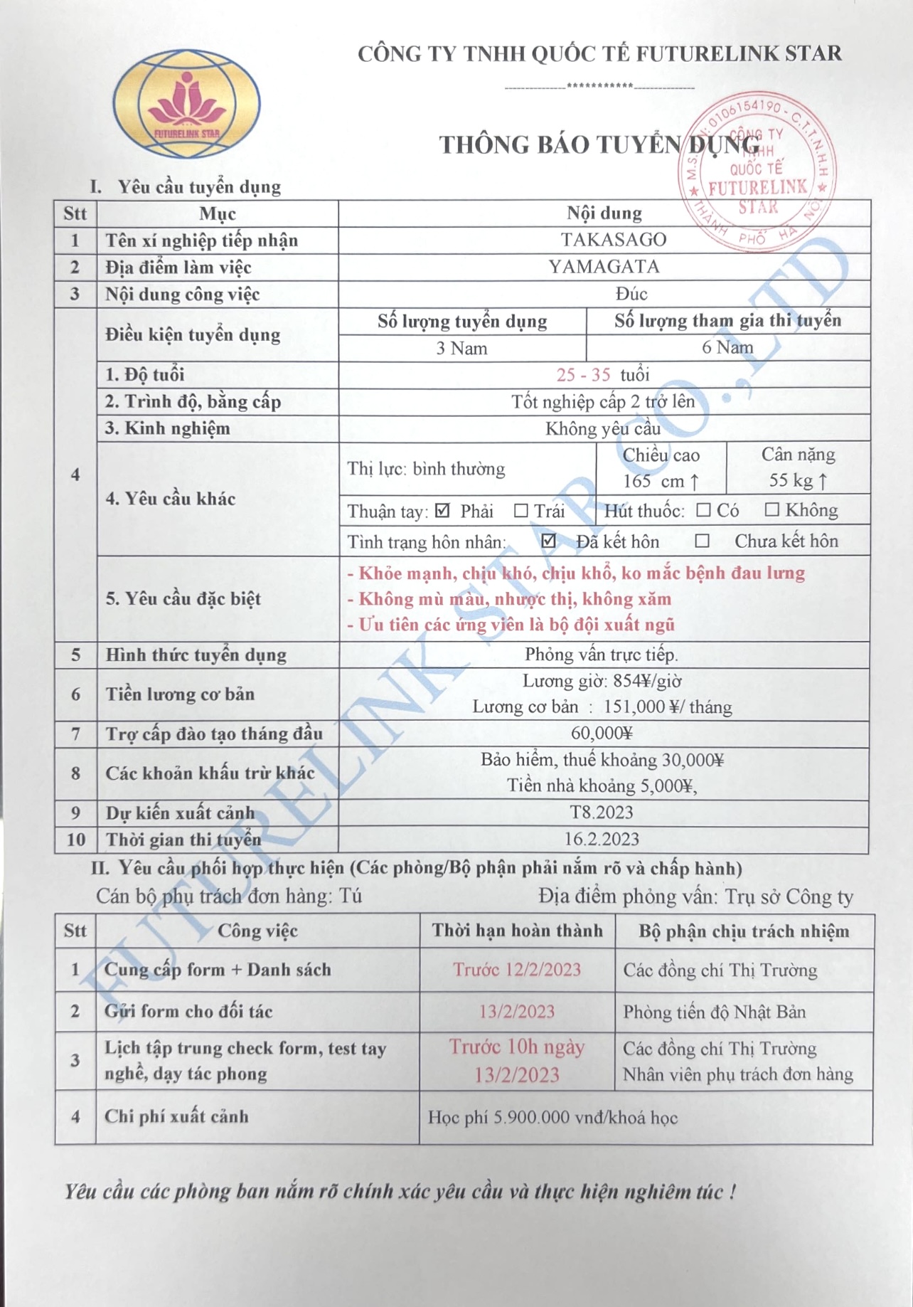 1. TUYỂN 3 NAM ĐÚC TỈNH YAMAGATA. LƯƠNG CƠ BẢN 151,000 YÊN/THÁNG. PHỎNG VẤN 16.2