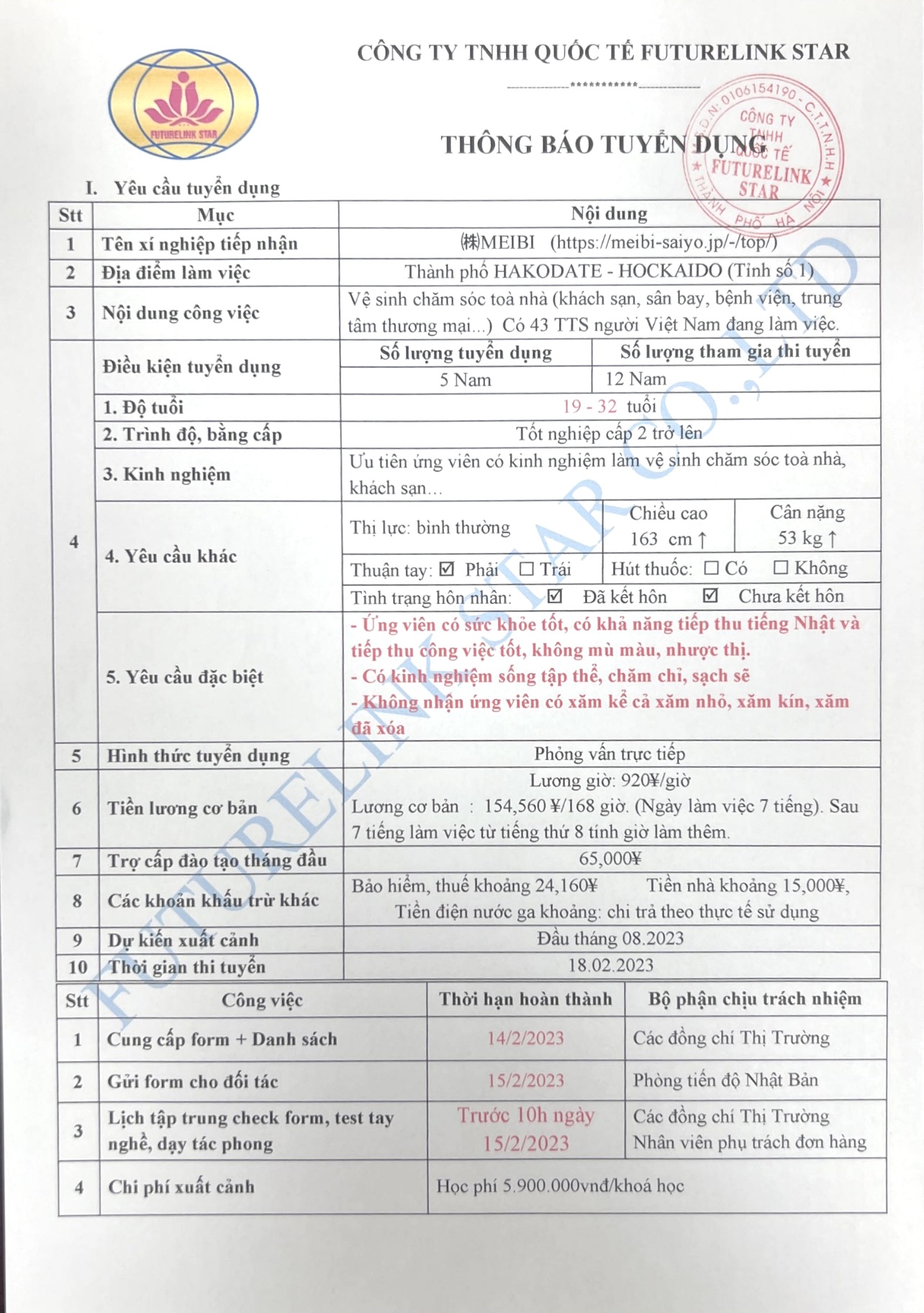 2. TUYỂN 5 NAM VỆ SINH KHÁCH SẠN TỈNH HAKODATE, HOKKAIDO. LƯƠNG CƠ BẢN 154,560 YÊN/THÁNG. PHỎNG VẤN 16.2