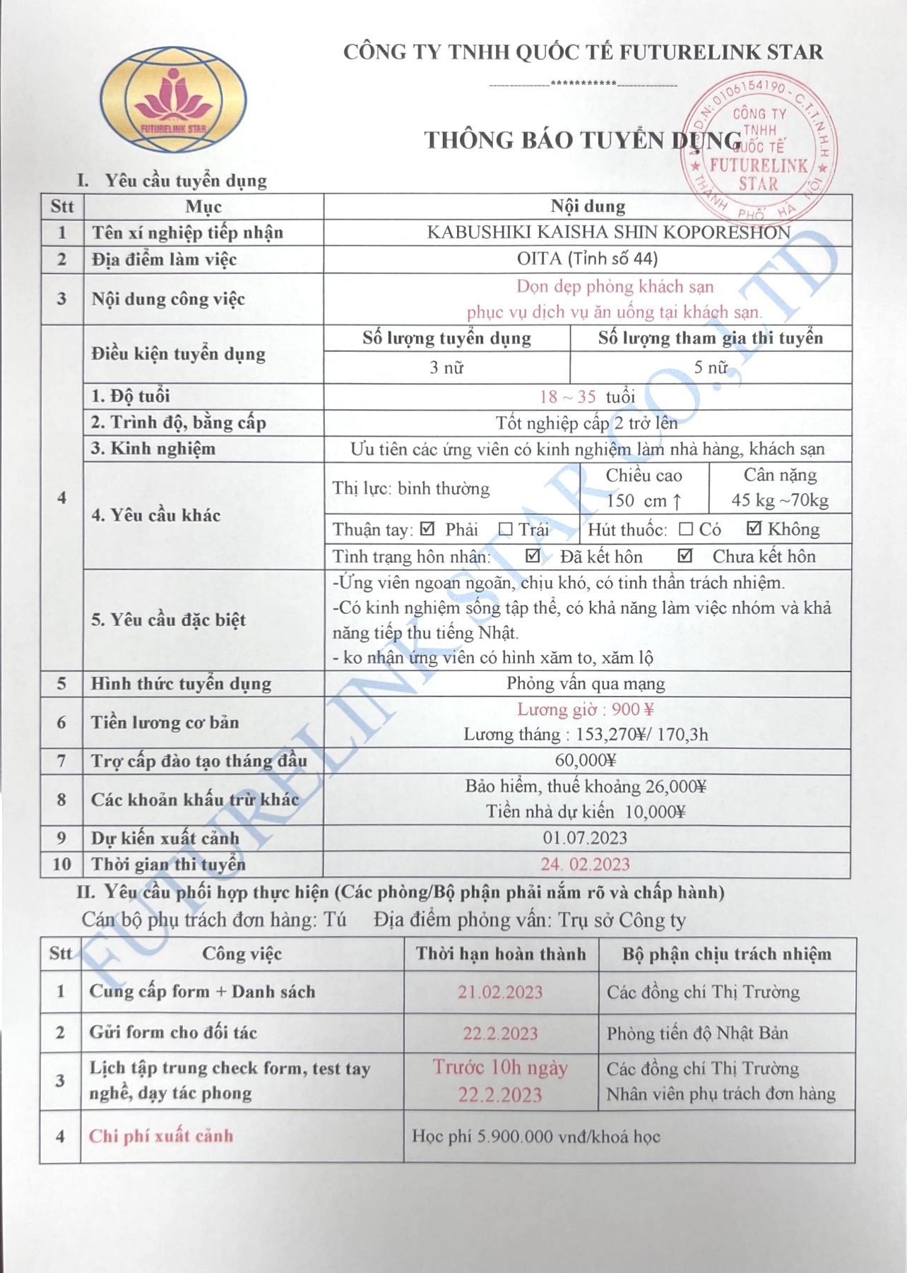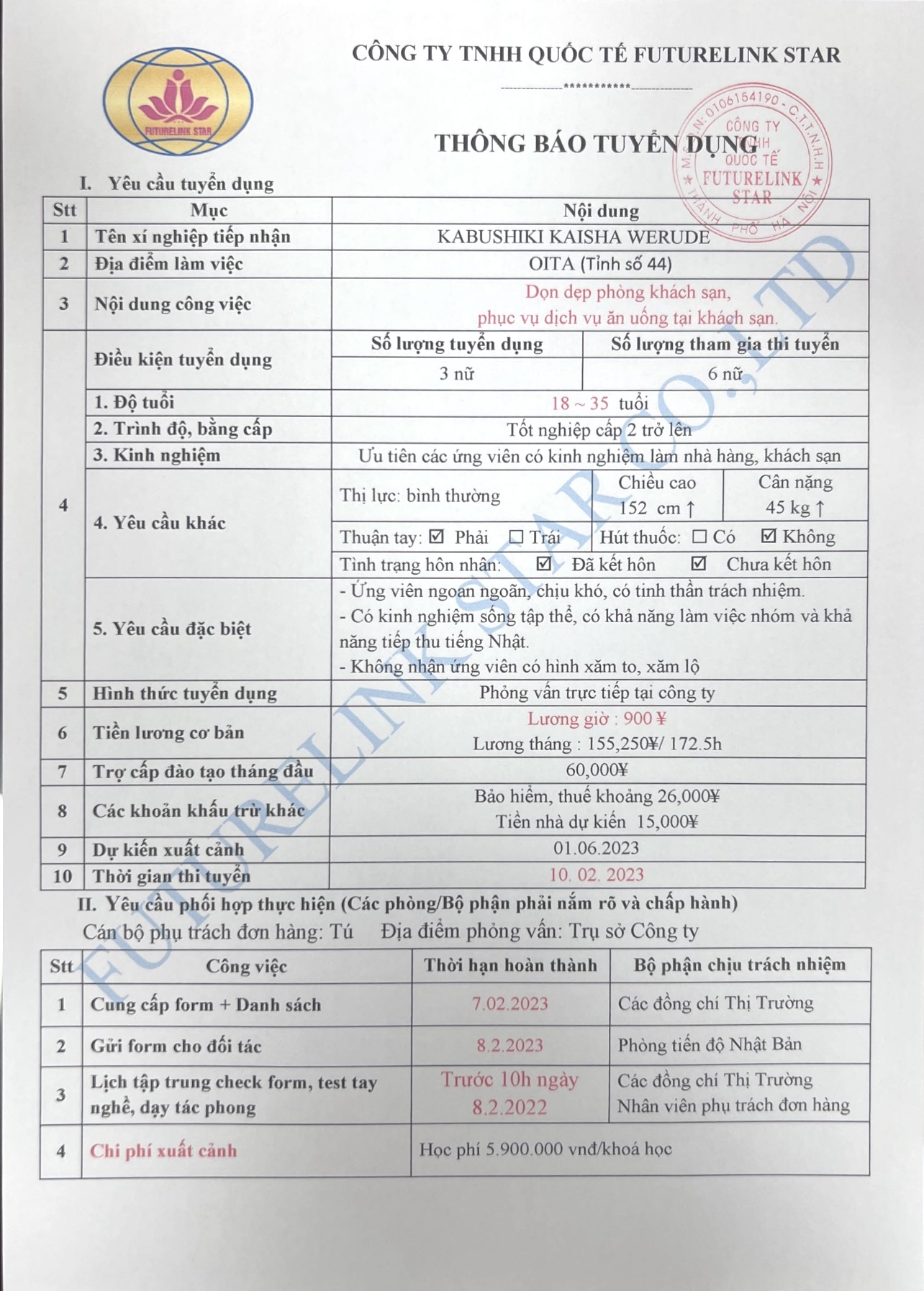 3. TUYỂN 3 NỮ DỌN DẸP KHÁCH SẠN TỈNH OITA. LƯƠNG THÁNG 153,270 YÊN/THÁNG. PHỎNG VẤN 24.2