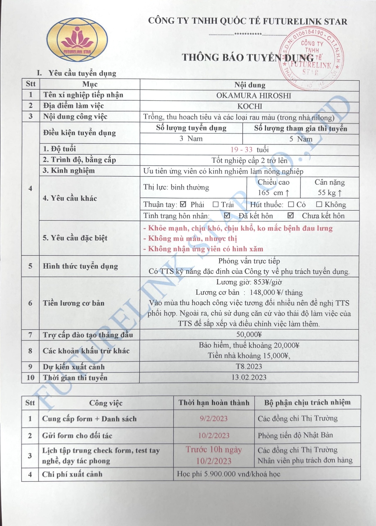 6. TUYỂN 3 NAM NÔNG NGHIỆP TỈNH KOCHI. LƯƠNG LƯƠNG CƠ BẢN 148,000 YÊN/THÁNG.