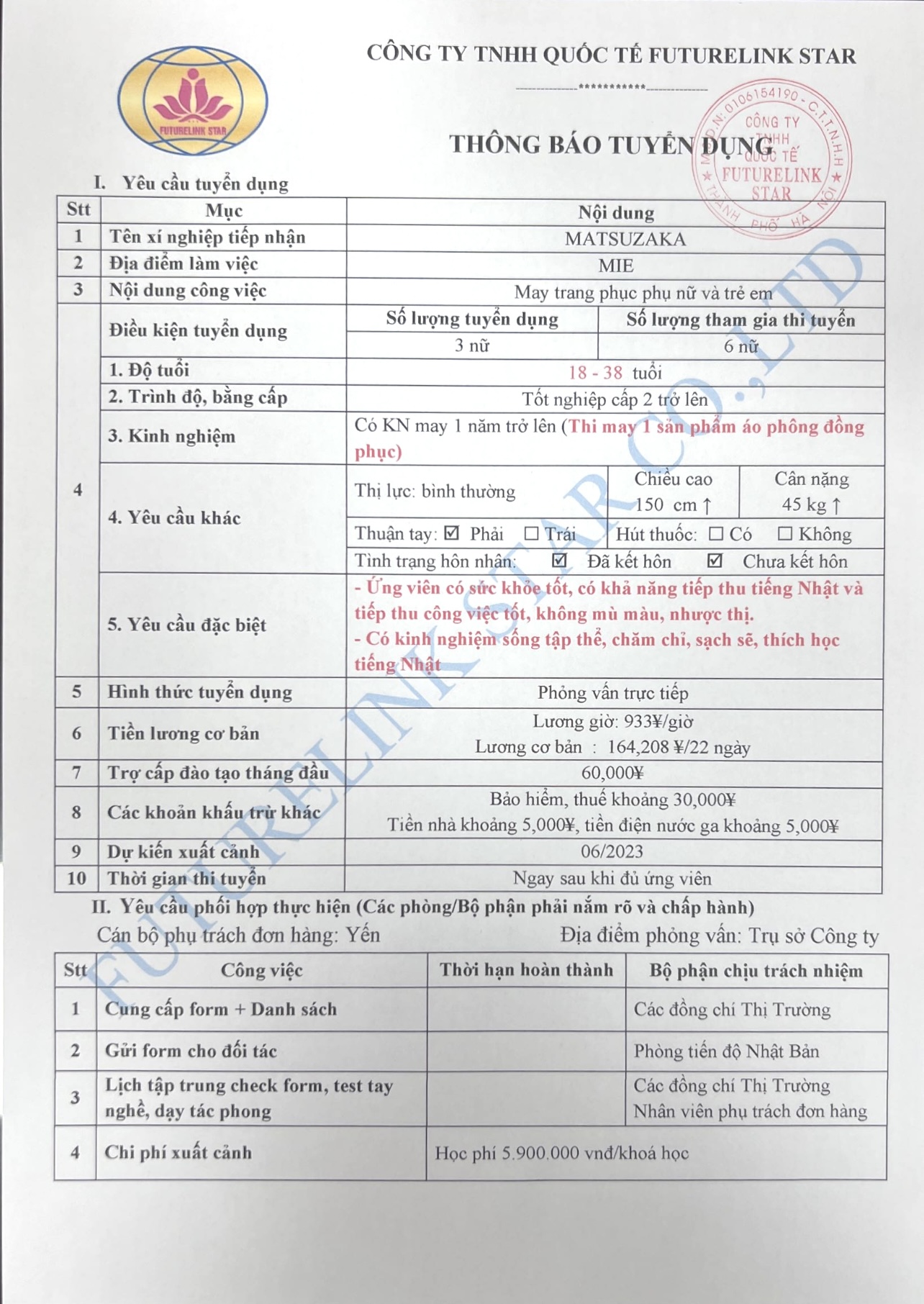 7. TUYỂN 3 NỮ MAY MẶC TỈNH MIE. LƯƠNG CƠ BẢN 164,208 YÊN/THÁNG.