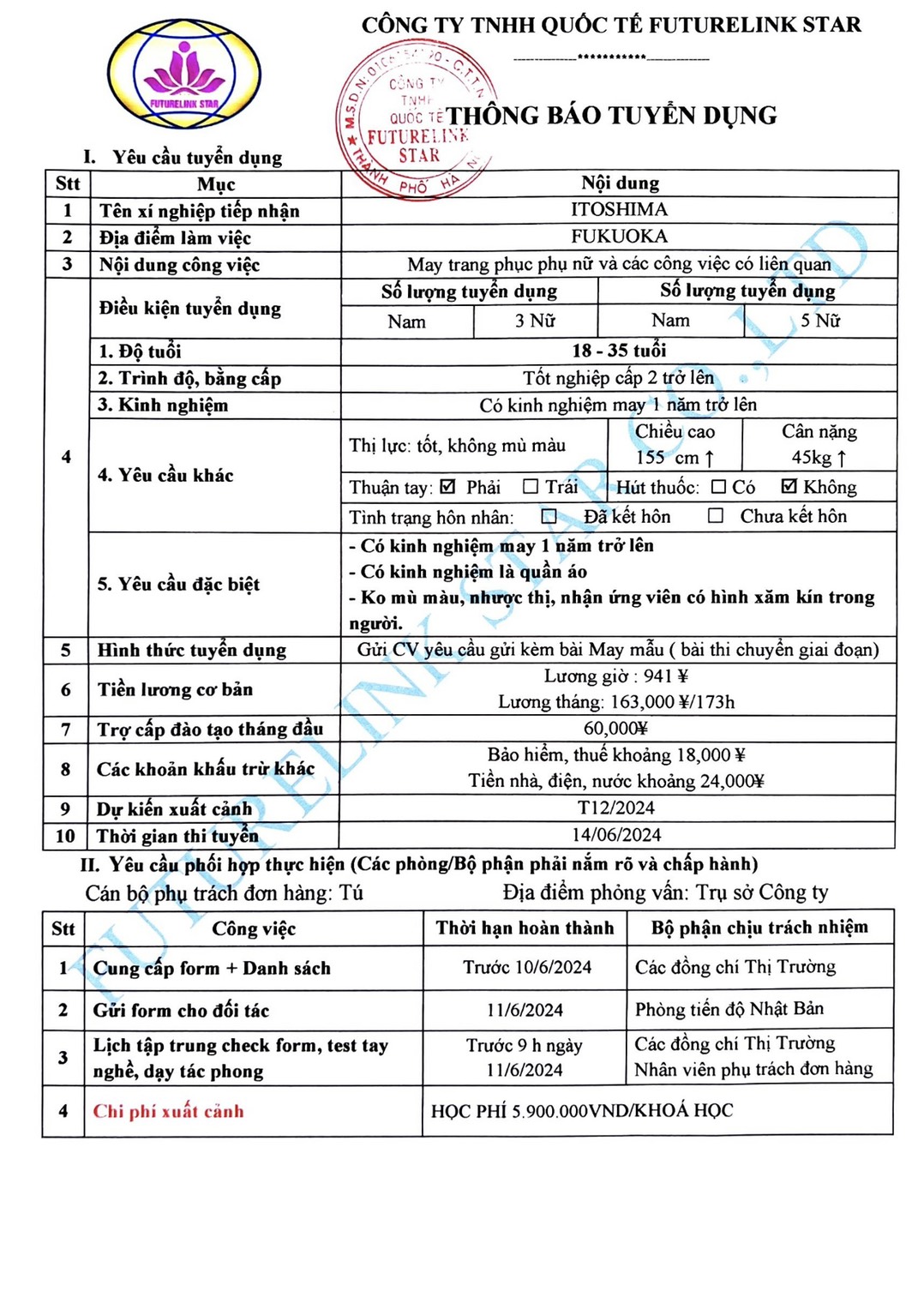 2. Tuyển 3 nữ may trang phục phụ nữ và trẻ em tỉnh Fukuoka, lương tháng 163,000 yên/tháng. Phỏng vấn 14.6
