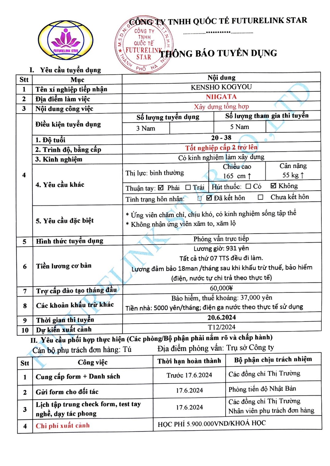 4. Tuyển 3 nam xây dựng tổng hợp tỉnh Nigata, lương đảm bảo 180,000 yên/tháng sau khấu trừ. Phỏng vấn 20.6