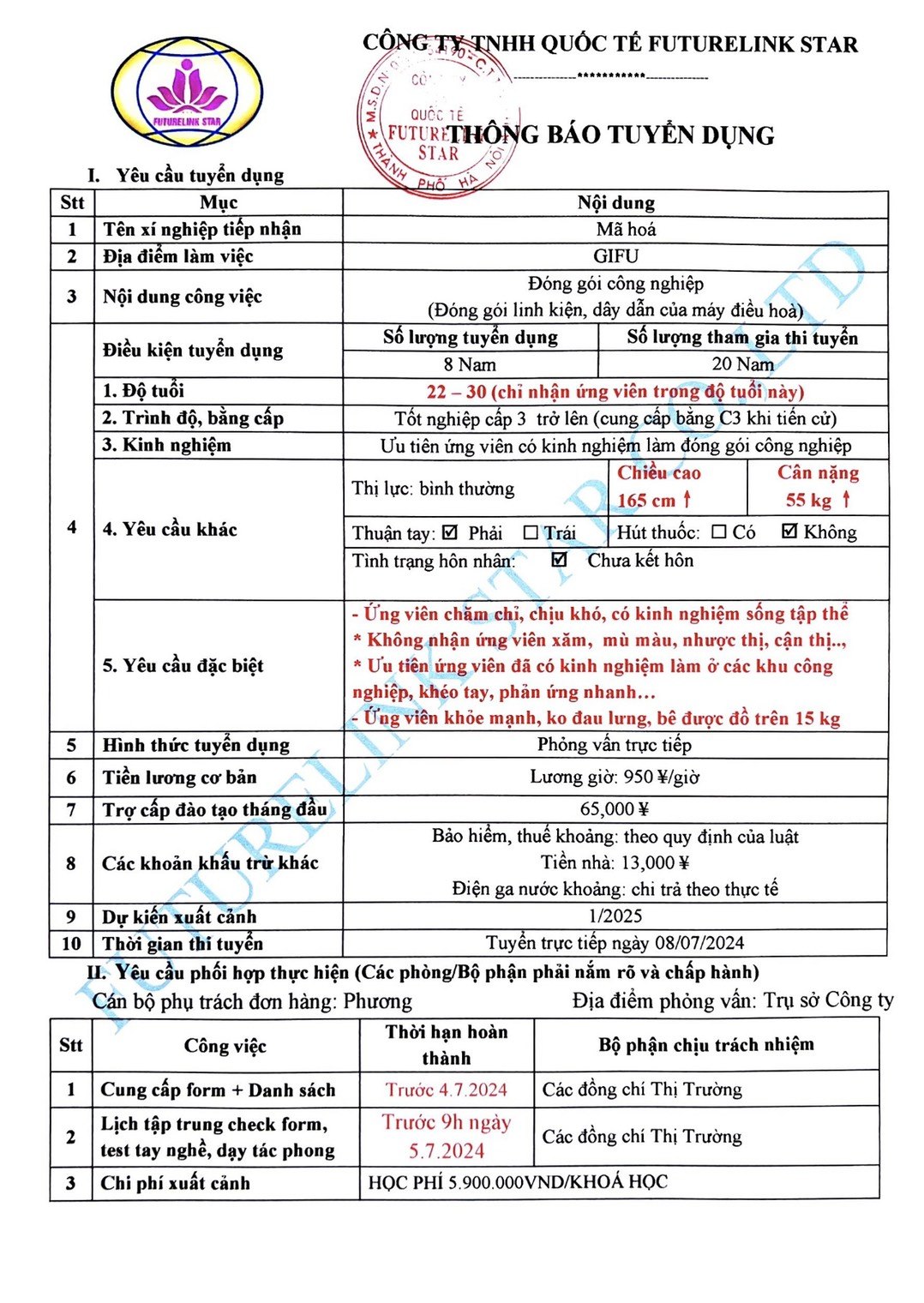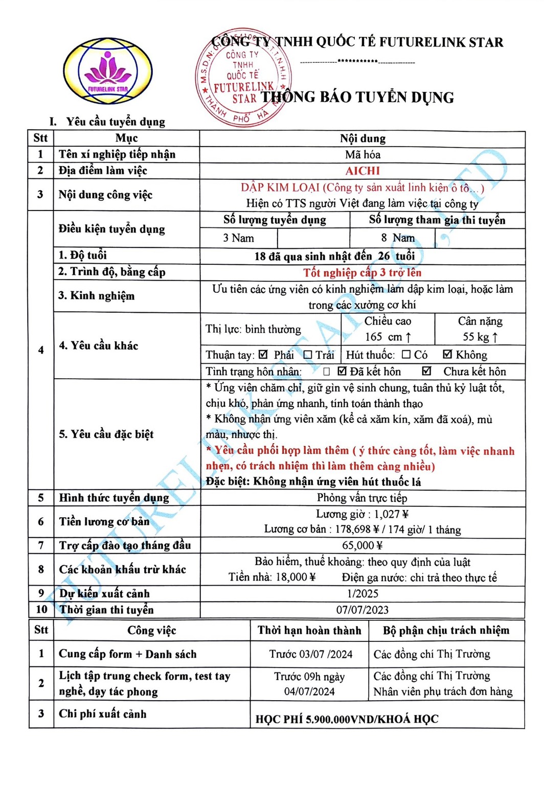 5. Tuyển 3 nam dập kim loại tỉnh Aichi, lương cơ bản 178,698 yên/tháng. Phỏng vấn 7.7