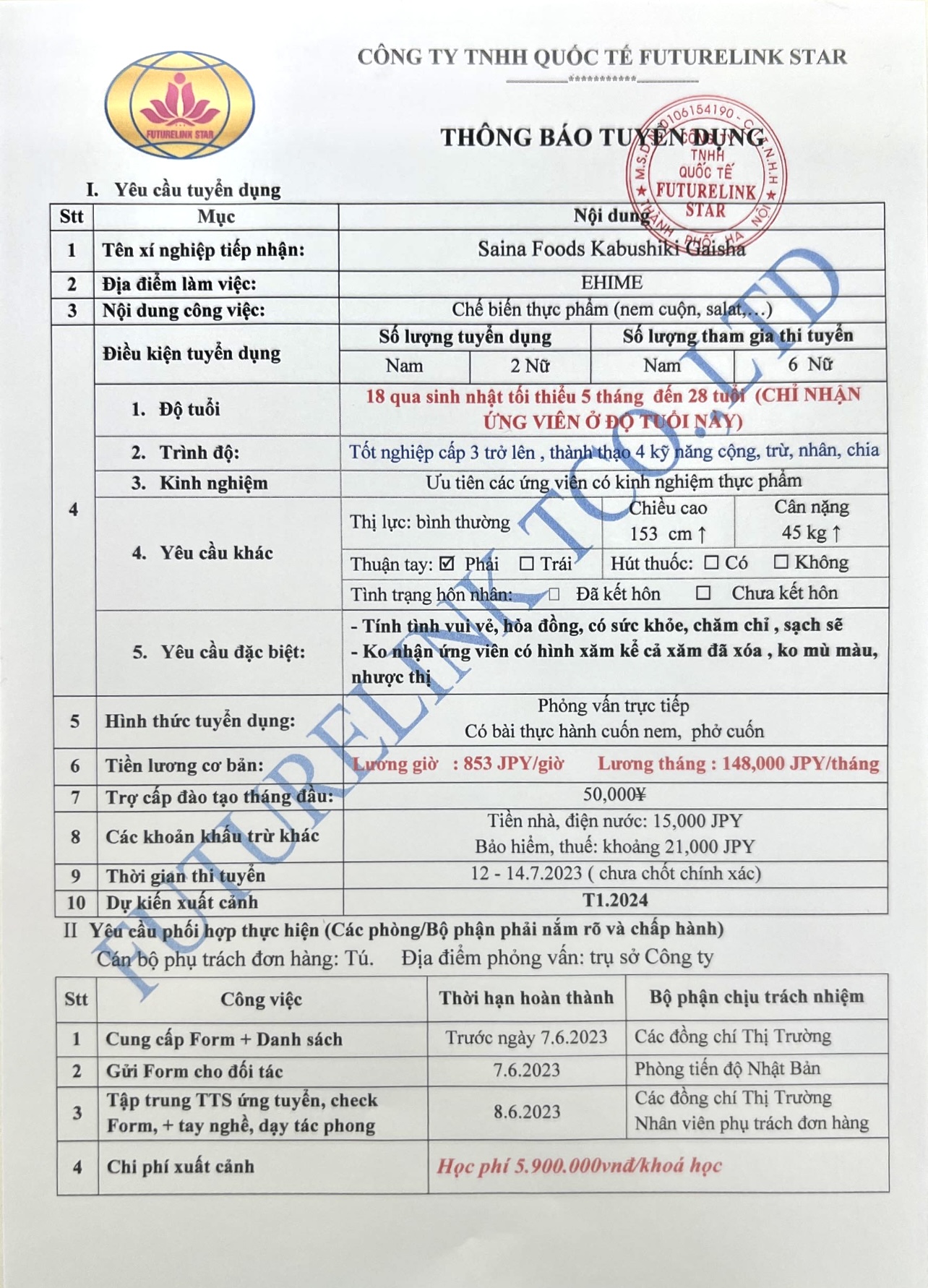- TUYỂN 2 NỮ CHẾ BIẾN THỰC PHẨM TỈNH EHIME. LƯƠNG THÁNG 148,000 YÊN/THÁNG (THỰC LĨNH ĐỀU 16-18MAN) PHỎNG VẤN 12.7
