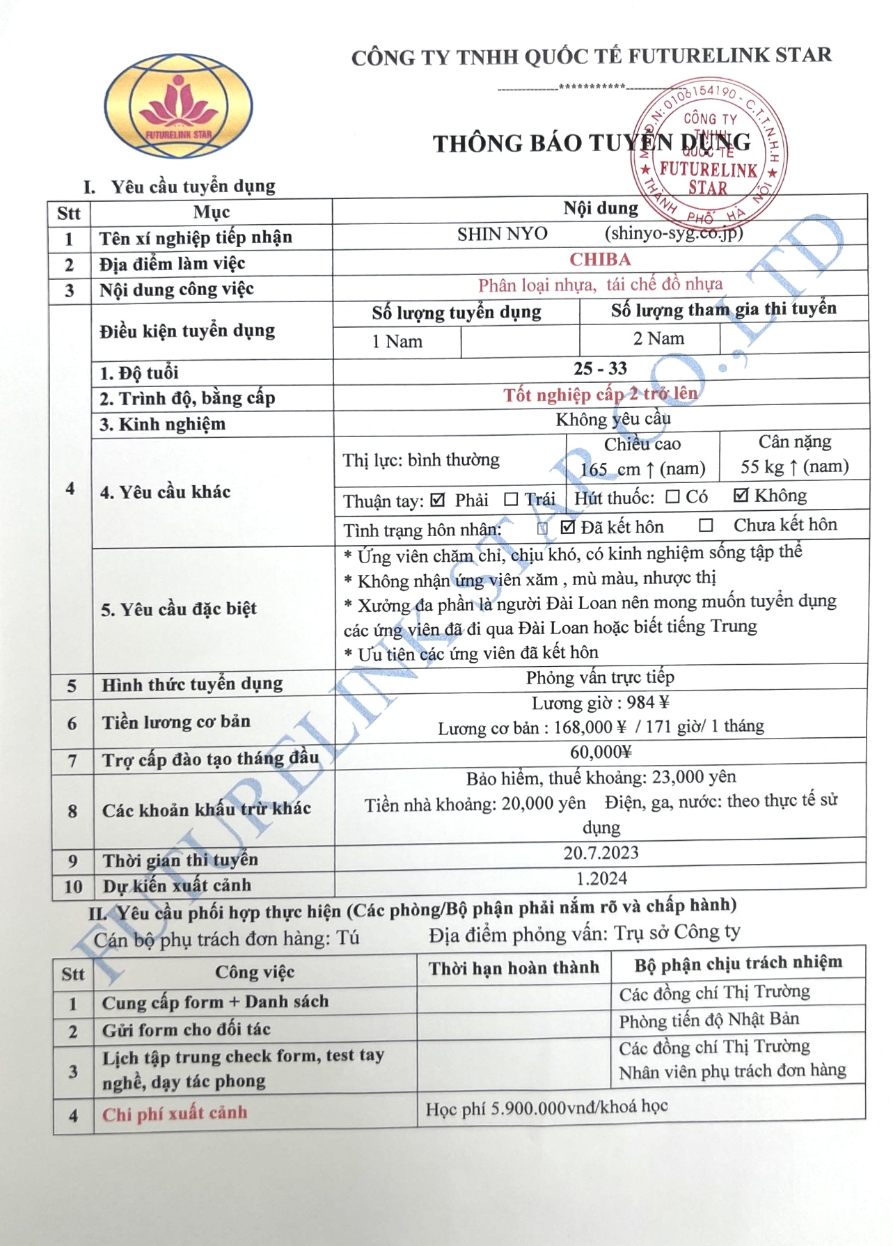 2. TUYỂN 1 NAM PHÂN LOẠI NHỰ, TÁI CHẾ ĐỒ NHỰA, CHỈ NHẬN CÁC BẠN BIẾT TIẾNG TRUNG, HOẶC ĐÃ ĐI ĐÀI LOAN. LƯƠNG CƠ BẢN 168,000 YÊN/THÁNG. PHỎNG VẤN 20.7