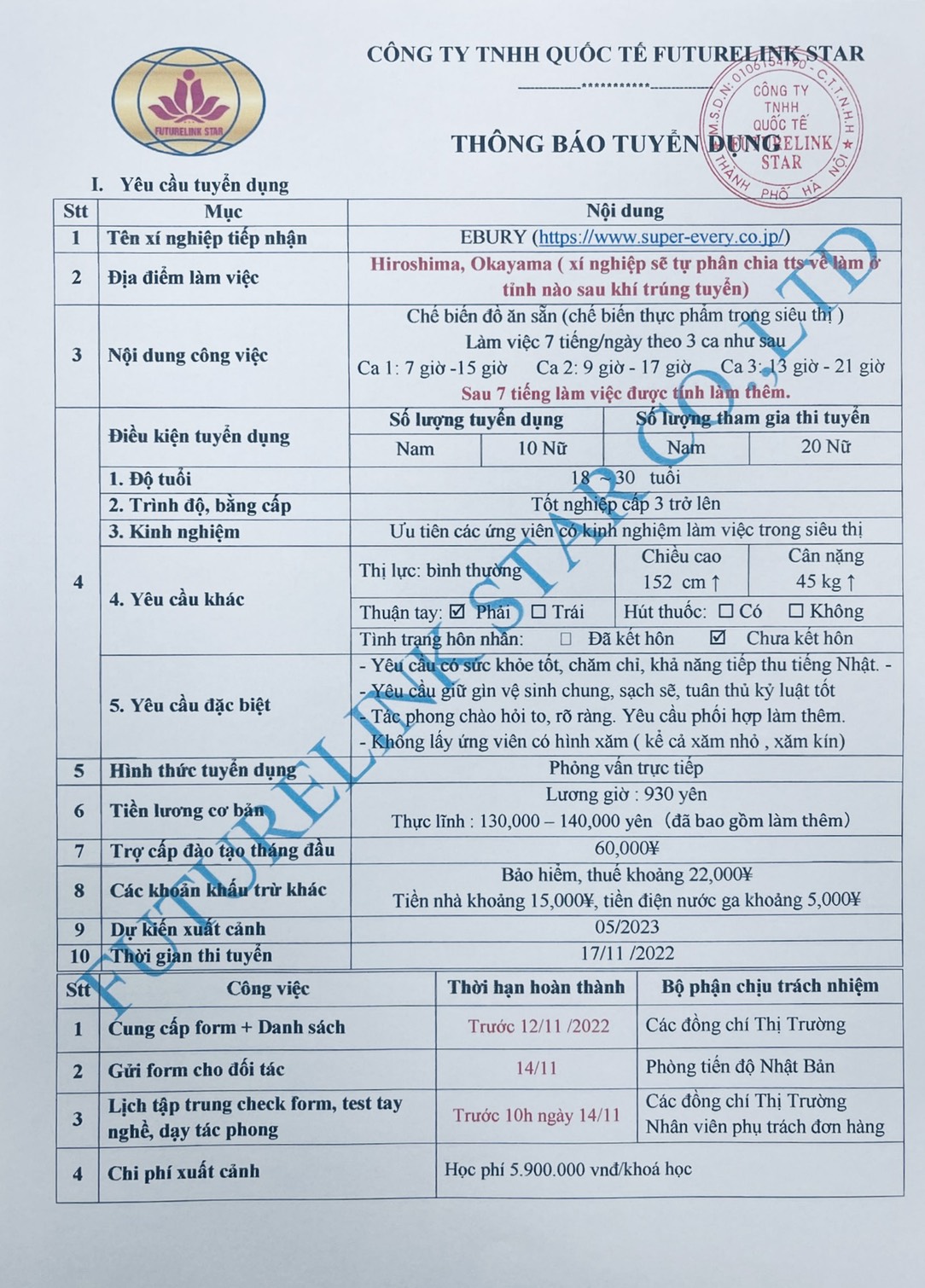 2. TUYỂN 10 NỮ THỰC PHẨM TỈNH HIROSHIMA, OKAYAMA(SẮP THÊM ĐỊA ĐIỂM THEO CHỦ SỬ DỤNG). LƯƠNG THỰC LĨNH SAU KHẤU TRỪ 130.000 – 140.000 YÊN/THÁNG. HIỆN ĐANG CÓ HƠN 30 TTS CỦA FUTURELINK ĐANG LÀM VIỆC TẠI ĐÂY. PHỎNG VẤN 17.11