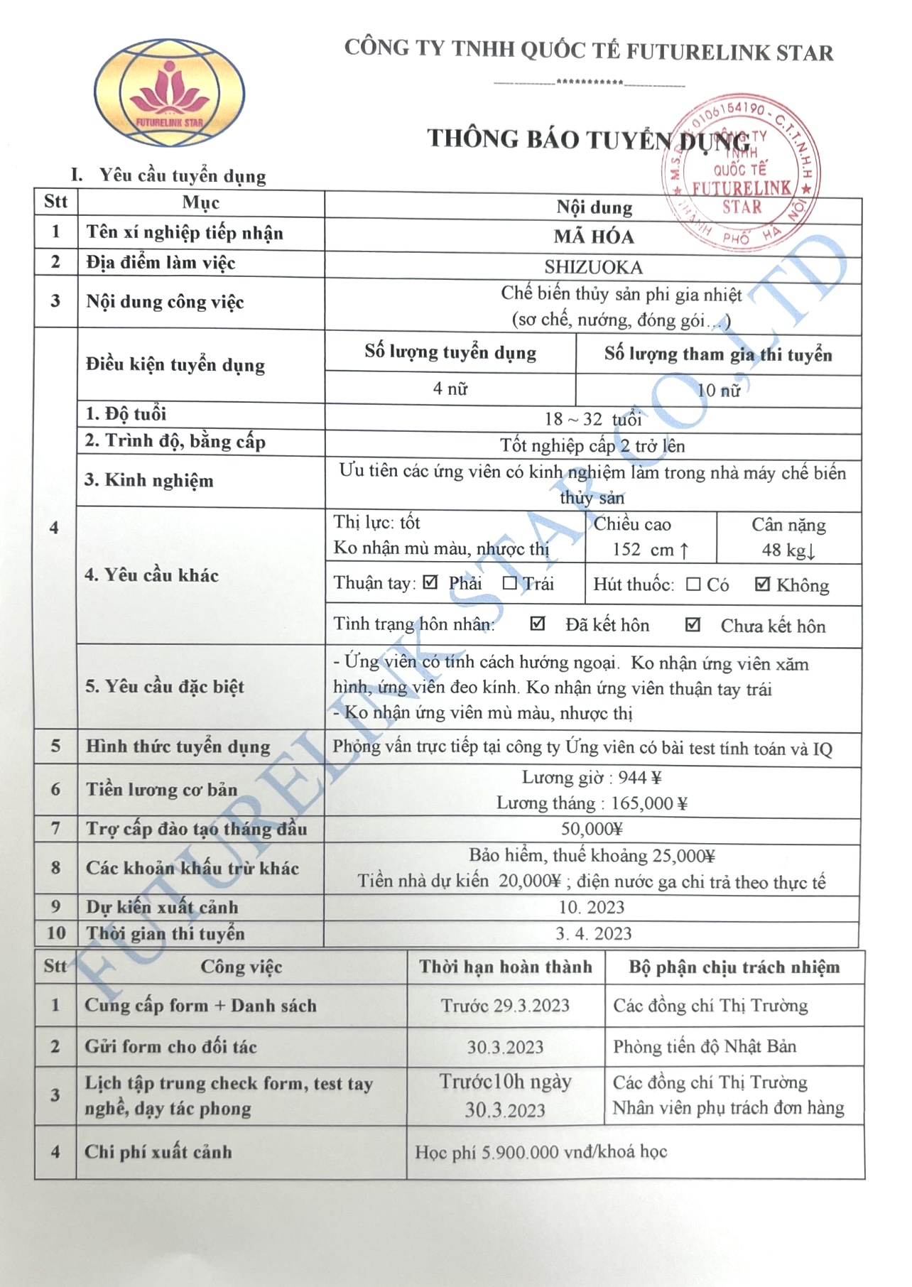 1.TUYỂN 4 NỮ CHẾ BIẾN THUỶ SẢN TỈNH SHIZUOKA. LƯƠNG THÁNG 165,000 YÊN/THÁNG. PHỎNG VẤN 3.4