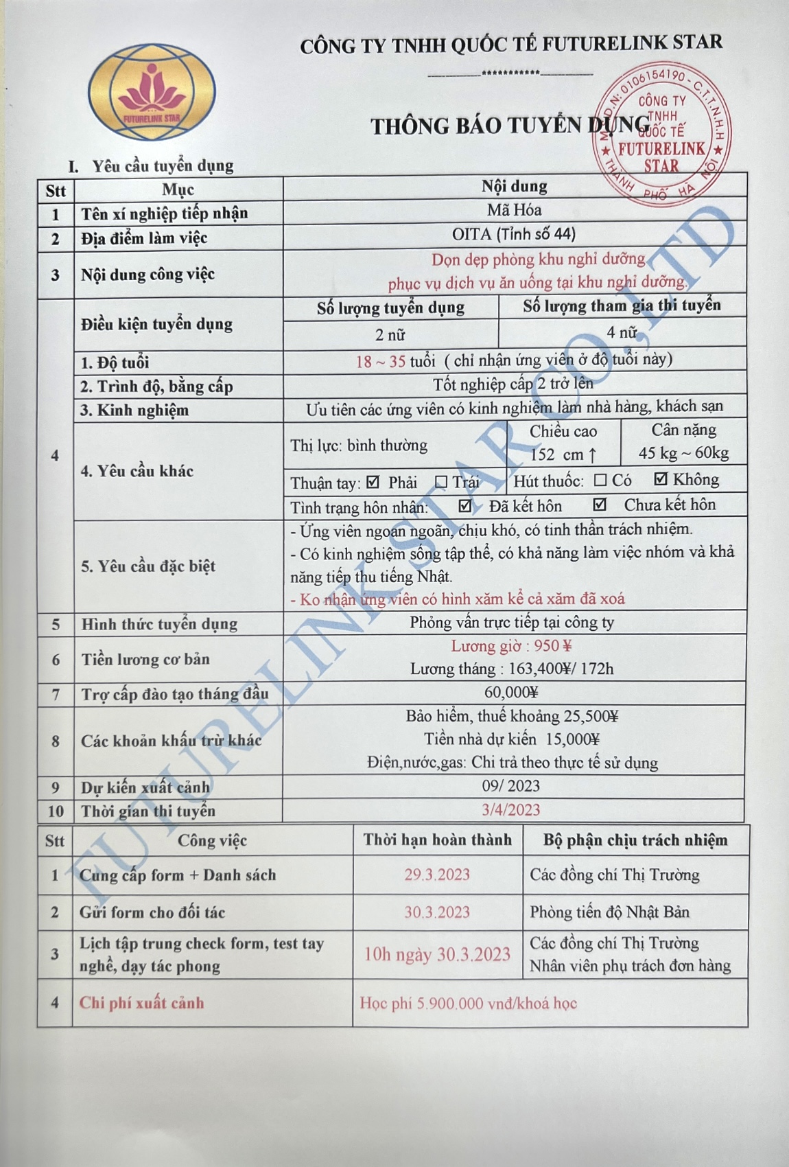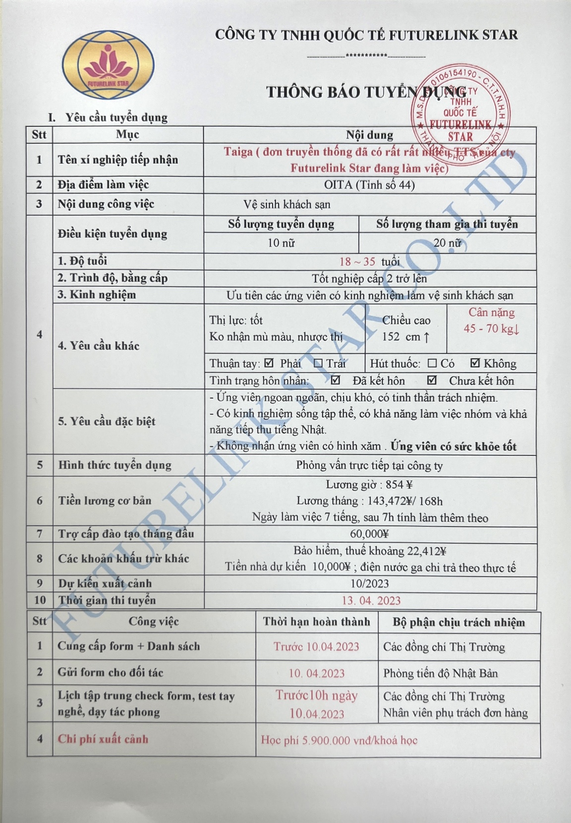 4. TUYỂN 10 NỮ VỆ SINH KHÁCH SẠN TỈNH OITA, LƯƠNG THÁNG 143,472 YÊN/THÁNG. NGÀY LÀM VIỆC 7H, SAU 7 TIẾNG TÍNH LÀM THÊM. PHỎNG VẤN 10.4