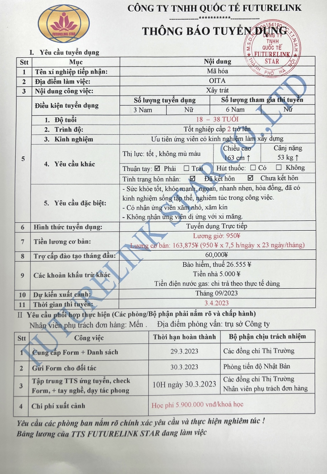 3.TUYỂN 3 NAM XÂY TRÁT TỈNH OITA. LƯƠNG CƠ BẢN 163,875 YÊN/THÁNG. PHỎNG VẤN 3.4