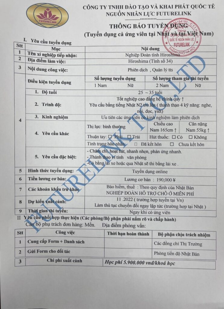 2. TUYỂN 1 NAM PHIÊN DỊCH CHO NGHIỆP ĐOÀN, TỈNH HIROSHIMA, LƯƠNG CƠ BẢN 190,000 YÊN/THÁNG. MIỄN PHÍ NHÀ Ở. PHỎNG VẤN NGAY SAU KHI ĐỦ ỨNG VIÊN