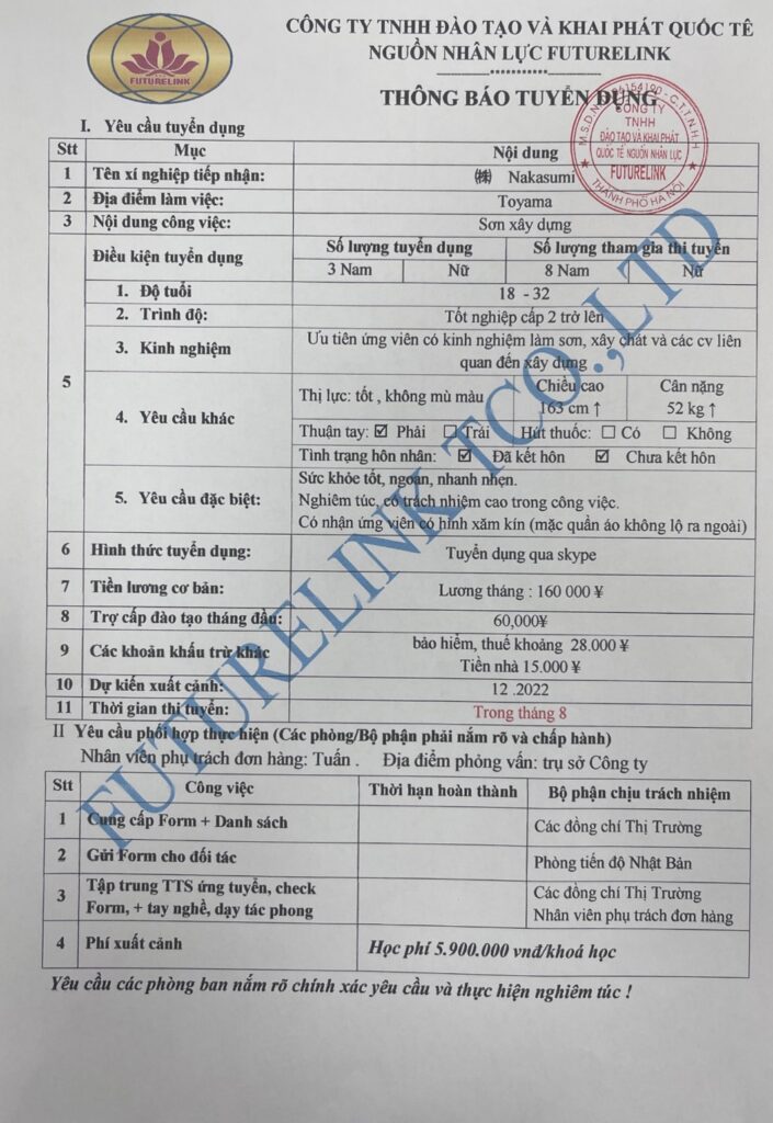 6. TUYỂN 3 NAM SƠN TỈNH TOYAMA, LƯƠNG THÁNG 160,000 YÊN/THÁNG. PHỎNG VẤN NGAY SAU KHI ĐỦ ỨNG VIÊN
