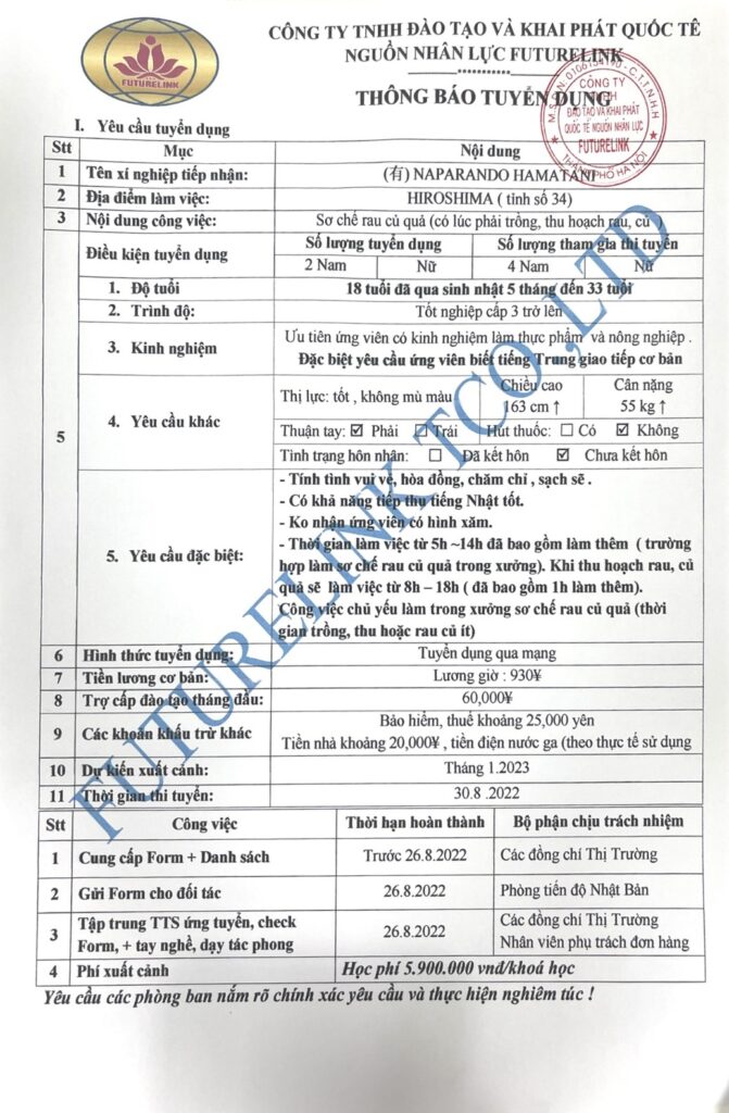 5. TUYỂN 3 NAM CHẾ BIẾN THỰC PHẨM, TỈNH HIROSHIMA , LƯƠNG GIỜ 930 YÊN/GIỜ. PHỎNG VẤN 30.8.2022