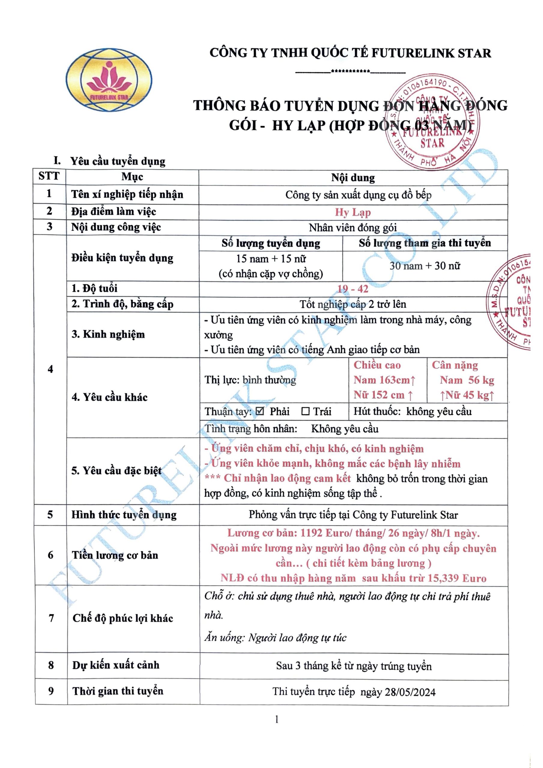Yêu cầu: Nam & Nữ từ 19 – 42 tuổi. Nam cao 163 cm, nặng 56kg. Nữ cao 153 cm, nặng 45kg, tốt nghiệp cấp 2 trở lên.