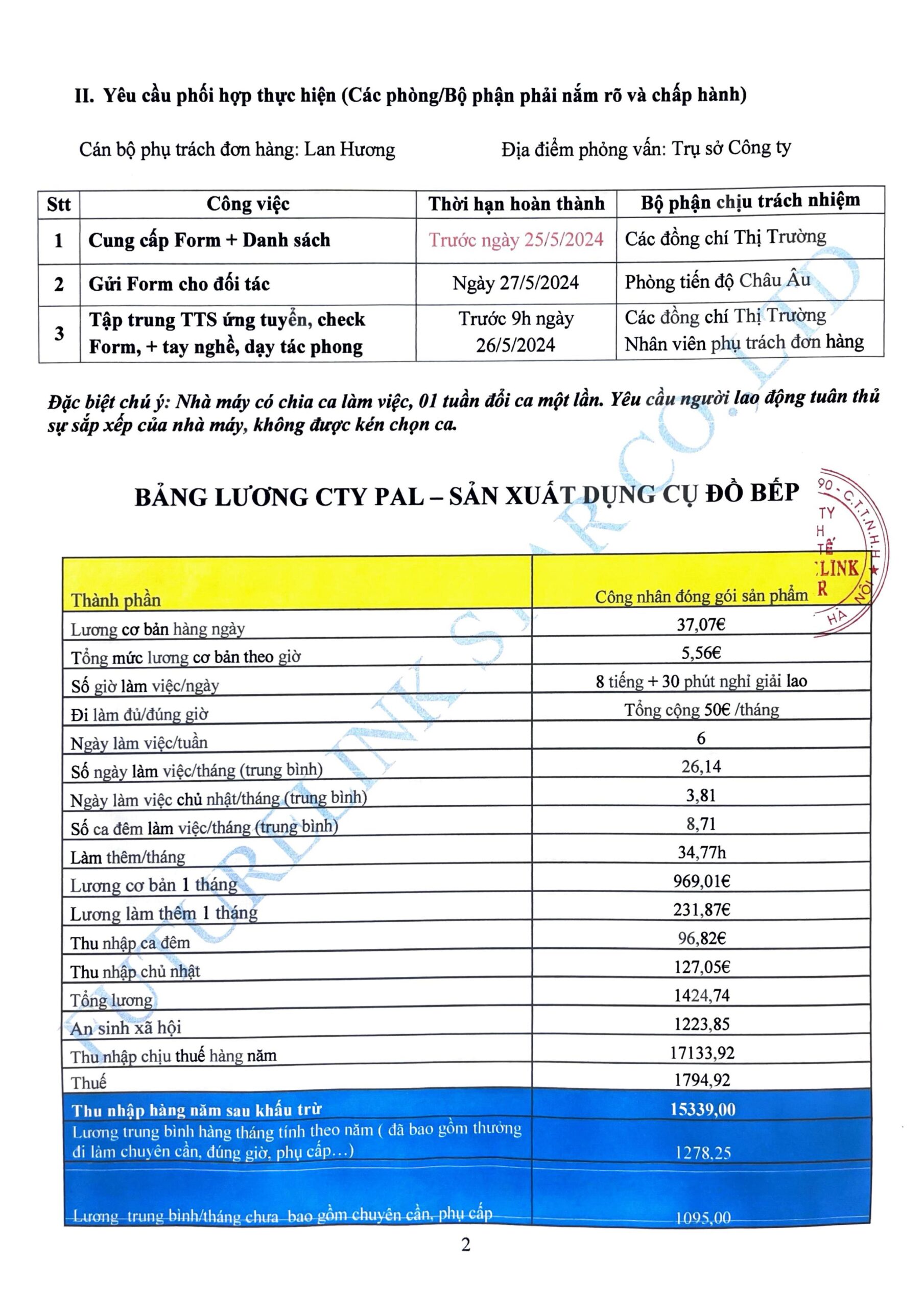 Lương cơ bản: 1192 Euro/ tháng/ 26 ngày/ 8h/1 ngày.