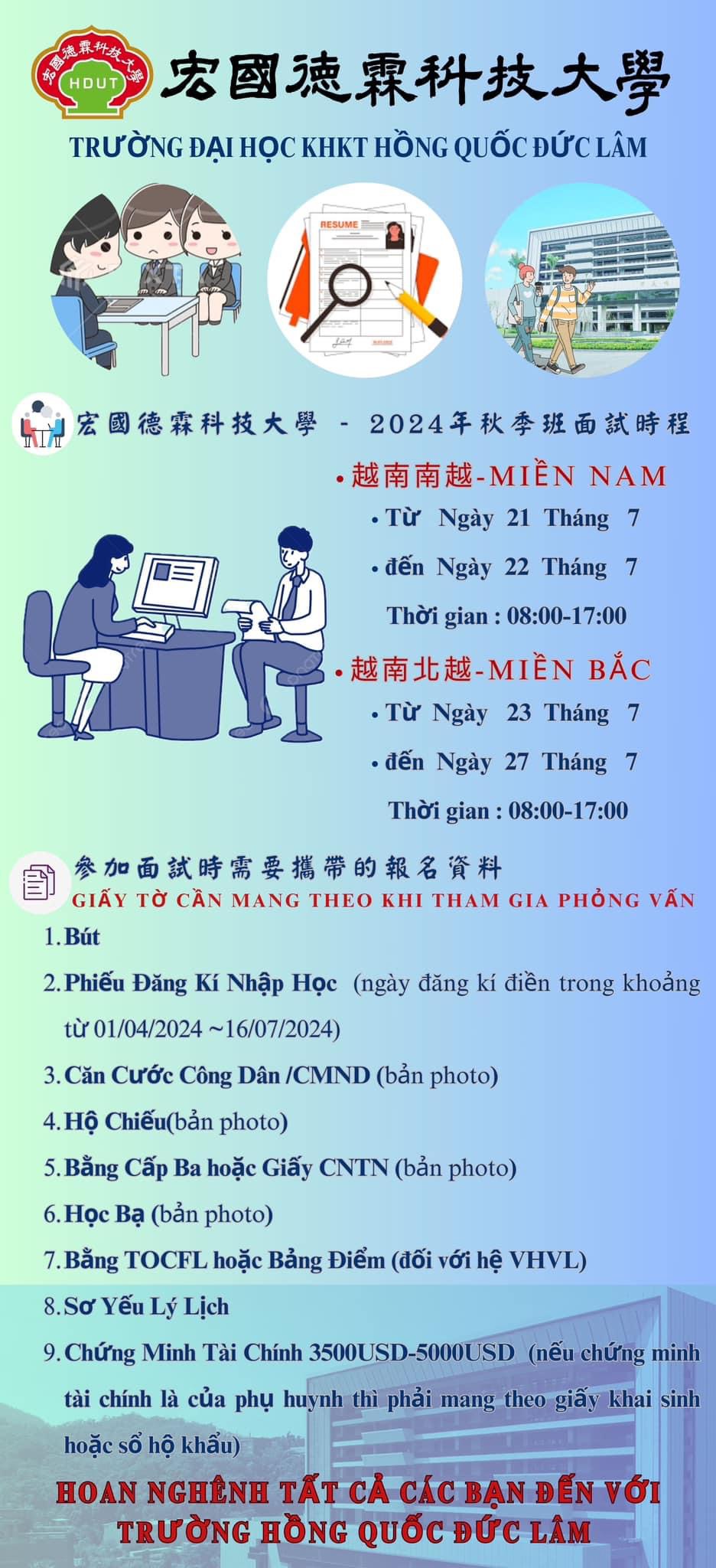 Du học, Đài Loan, Tin tức Lịch phỏng vấn trực tiếp ĐH Hồng quốc đức lâm kỳ mùa thu 2024 hệ 1+4 và hệ VHVL