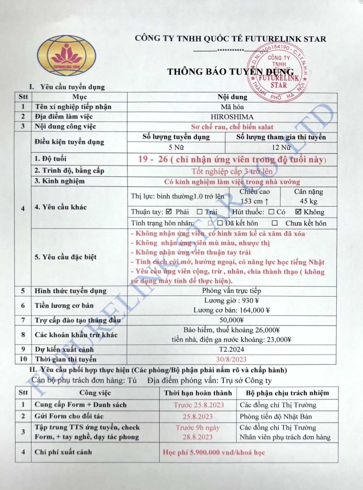 - TUYỂN 5 NỮ CHẾ BIẾN THỰC PHẨM TỈNH HIROSHIMA. LƯƠNG CƠ BẢN 164,000 YÊN/THÁNG. PHỎNG VẤN 30.8