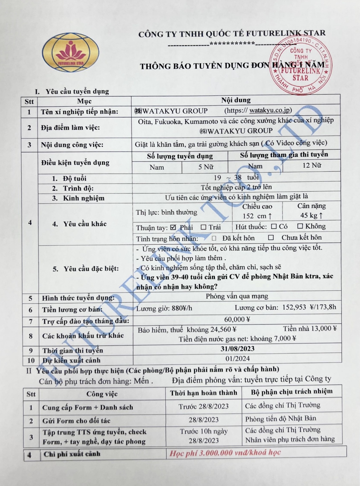 2. TUYỂN 5 NỮ GIẶT LÀ 1 NĂM TỈNH OITA. LƯƠNG CƠ BẢN 152,953 YÊN/THÁNG. PHỎNG VẤN 30.8