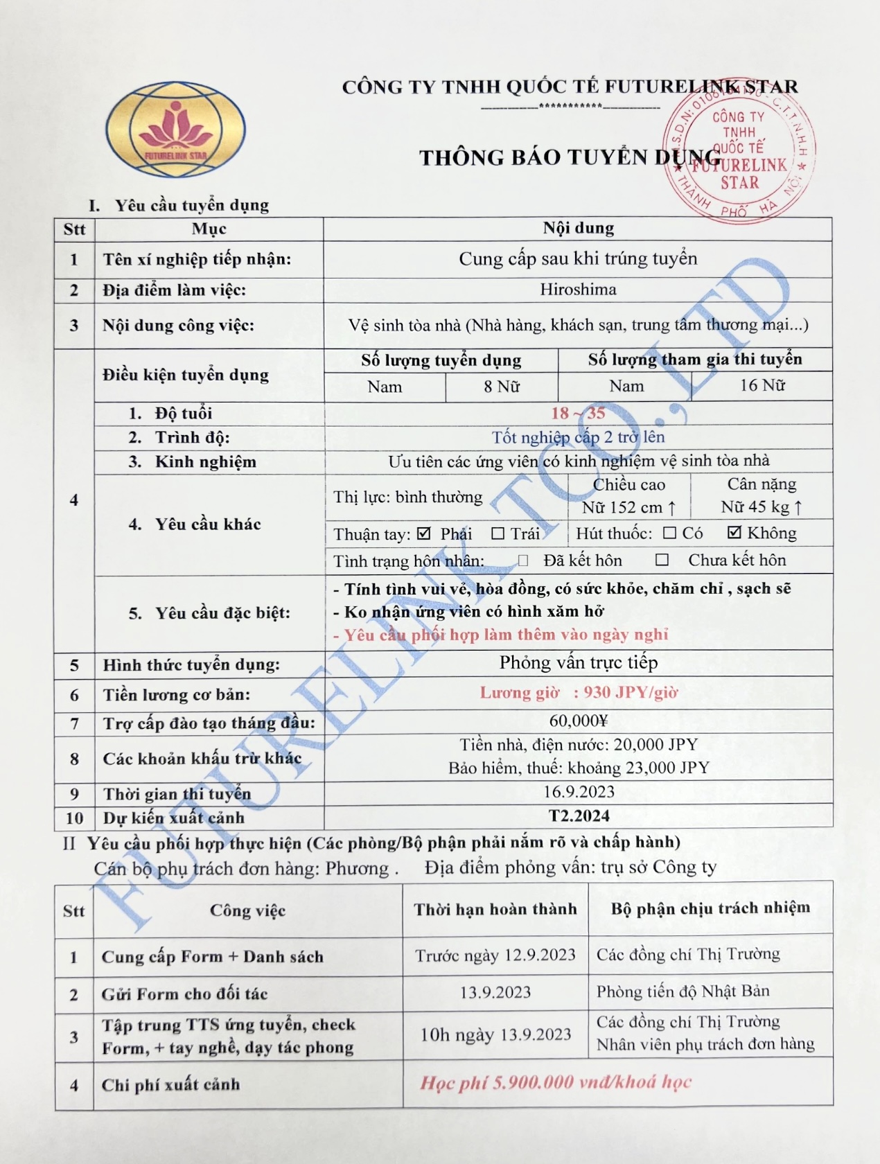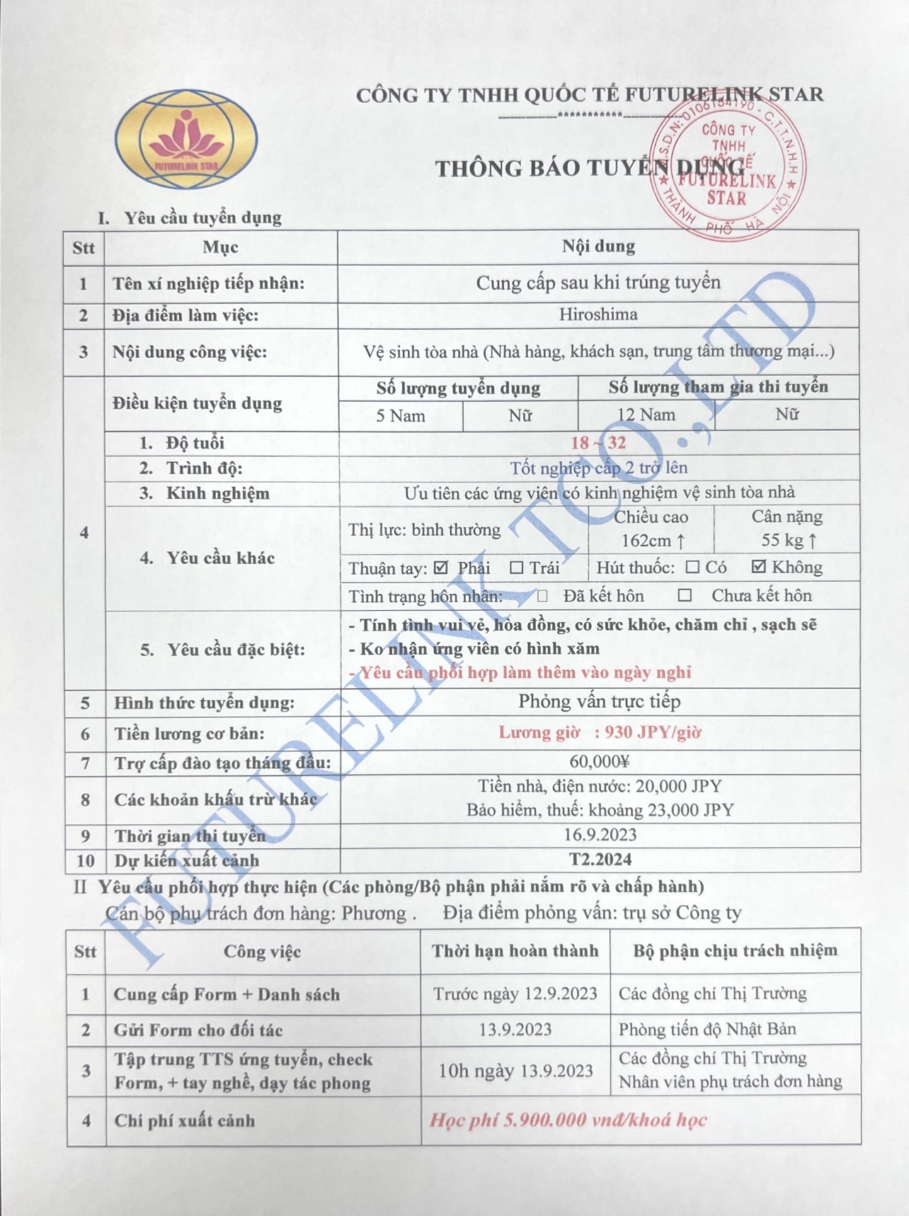 3. TUYỂN 5 NAM VỆ SINH TOÀ NHÀ(NHÀ HÀNG, KHÁCH SẠN,…) TỈNH HIROSHIMA, LƯƠNG GIỜ 930 YÊN/GIỜ. PHỎNG VẤN 16.9