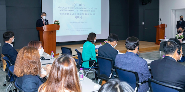 Nằm trong chuỗi sự kiện kỷ niệm 30 năm ngày thiết lập quan hệ ngoại giao giữa Việt Nam và Hàn Quốc (1992 – 2022) và hướng tới kỷ niệm 77 năm ngày thành lập ngành Lao động – Thương binh và Xã hội, ngày 25/8/2022, Ban Quản lý lao động Việt Nam tại Hàn Quốc đã tổ chức Hội thảo Nâng cao hiệu quả trong công tác hỗ trợ người lao động Việt Nam tại Hàn Quốc. Hội thảo nhằm điểm lại hoạt động đưa người lao động Việt Nam sang làm việc tại Hàn Quốc trong gần 30 năm qua, cũng như đánh giá thực trạng công tác hỗ trợ người lao động Việt Nam tại Hàn Quốc, đề xuất các giải pháp nâng cao hiệu quả thực hiện công tác này. Tham dự Hội thảo có Đại sứ đặc mệnh toàn quyền nước CHXHCN Việt Nam tại Đại hàn Dân Quốc Nguyễn Vũ Tùng, đại diện Cơ quan phát triển nguồn nhân lực Hàn Quốc (HRDK), giám đốc các Trung tâm hỗ trợ lao động người nước ngoài, đại diện cơ quan bảo hiểm hưu trí, xuất nhập cảnh…