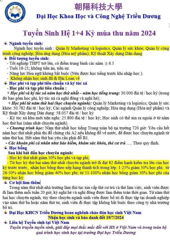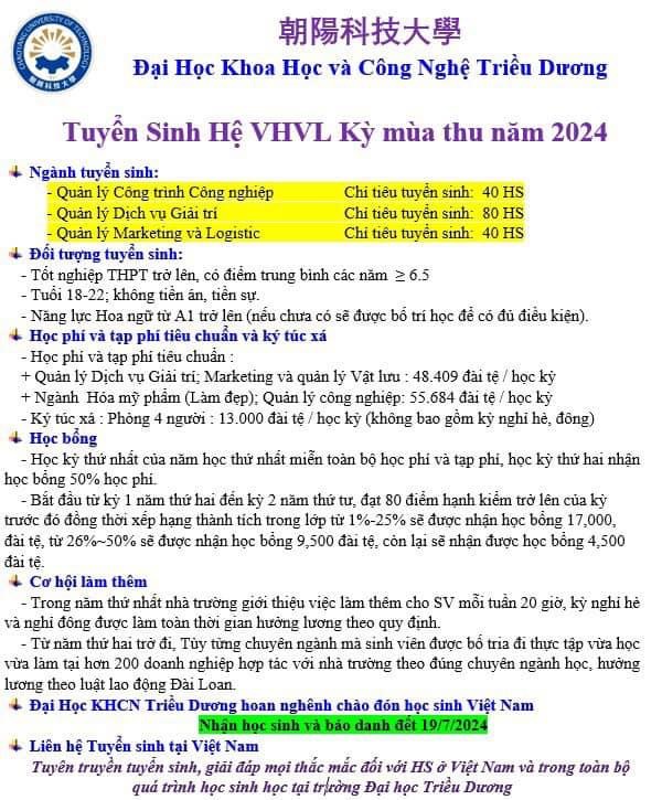 Du học, Đài Loan, Tin tức Sau khi thống nhất với Trường Triều Dương, Nhà trường sẽ nhận học sinh váo danh đến hết ngày 19/7/2024, phỏng vấn lần cuối vào ngày 21/7/2024. Gồm cả hệ VHVL và hệ 1+4