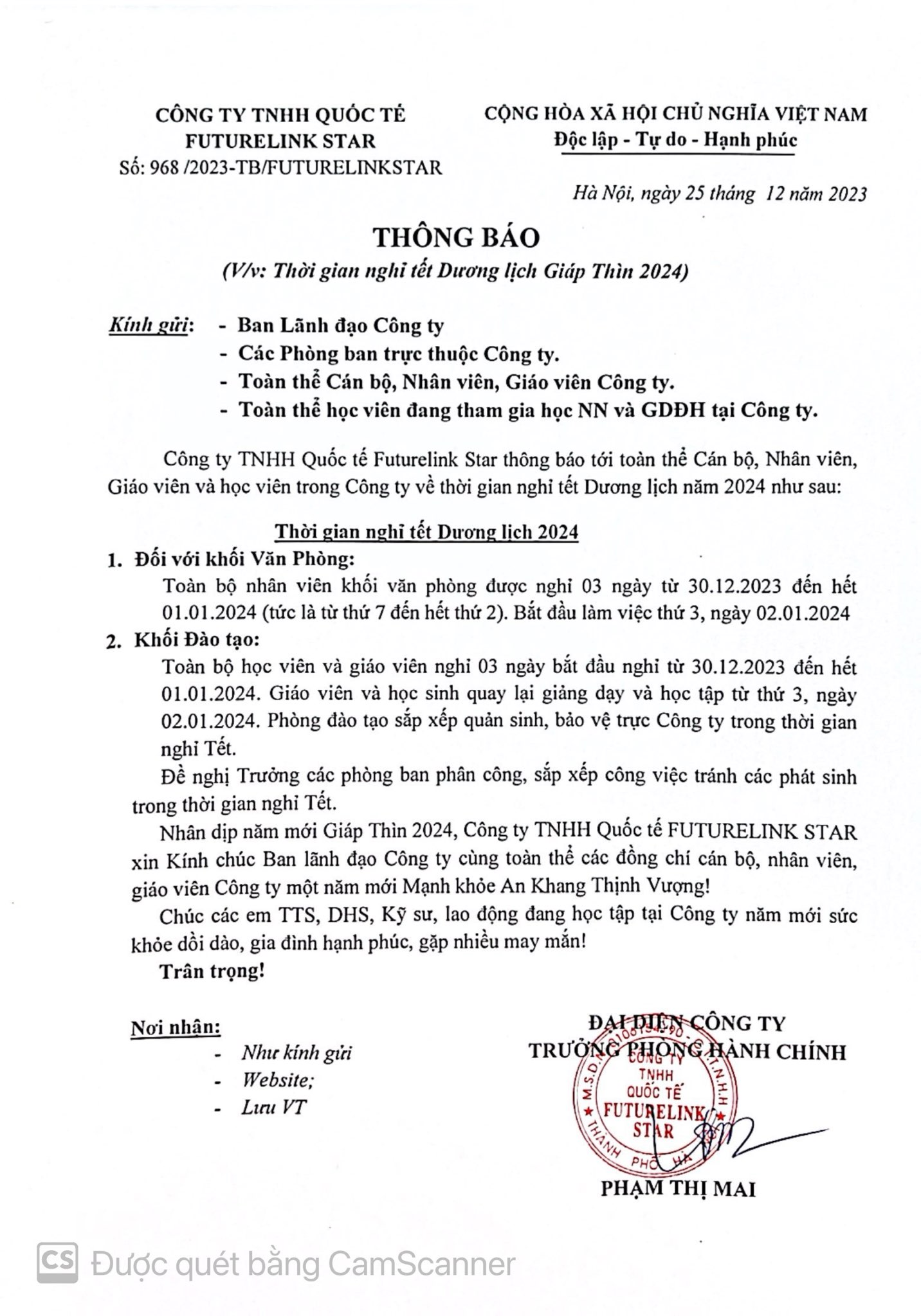 KÍNH GỬI QUÝ ĐỐI TÁC, QUÝ KHÁCH HÀNG, CÁN BỘ CÔNG NHÂN VIÊN CÔNG TY CÙNG TOÀN THỂ CÁC EM HỌC VIÊN ĐANG HỌC TẠI CÔNG TY LỊCH NGHỈ TẾT DƯƠNG LỊCH NĂM 2024. KÍNH CHÚC QUÝ ĐỐI TÁC, QUÝ KHÁCH HÀNG, CÁN BỘ CÔNG NHÂN VIÊN CÙNG CÁC EM HỌC SINH KỲ NGHỈ VUI VẺ, HẠNH PHÚC BÊN GIA ĐÌNH !