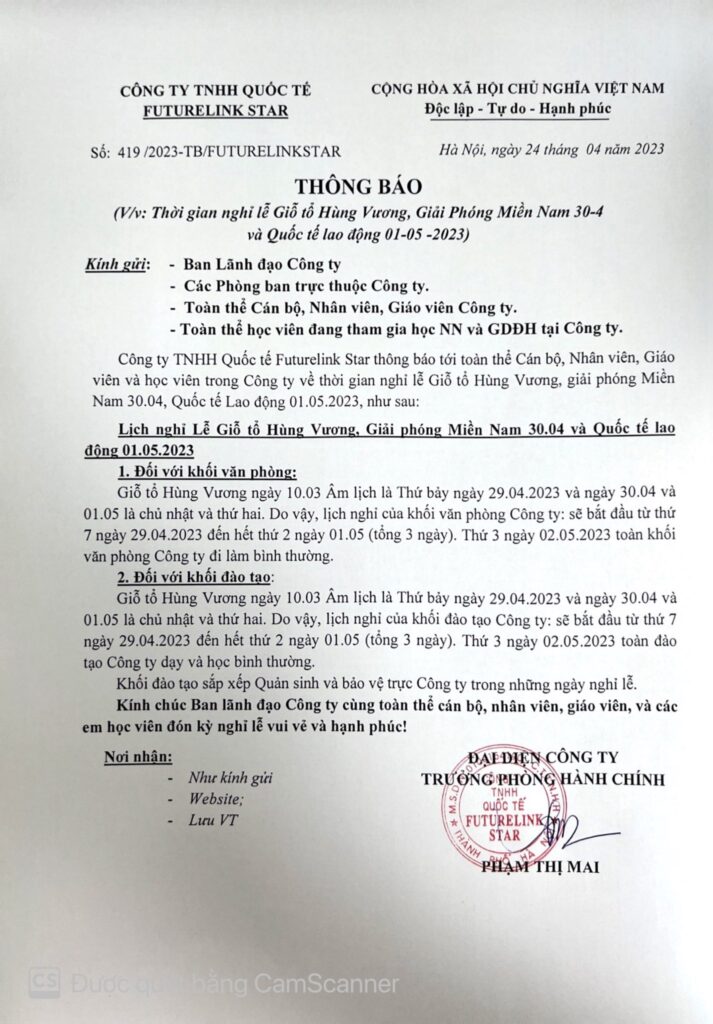 KÍNH GỬI QUÝ ĐỐI TÁC, QUÝ KHÁCH HÀNG CÙNG THỂ CÁN BỘ CÔNG NHÂN VIÊN, CÁC EM HỌC VIÊN LỊCH NGHỈ LỄ GIỔ TỔ HÙNG VƯƠNG, GIẢI PHÓNG MIỀN NAM 30/4 VÀ QUỐC TẾ LAO ĐỘNG 1/5 CỦA CÔNG TY TNHH QUỐC TẾ FUTURELINK STAR NHƯ SAU: