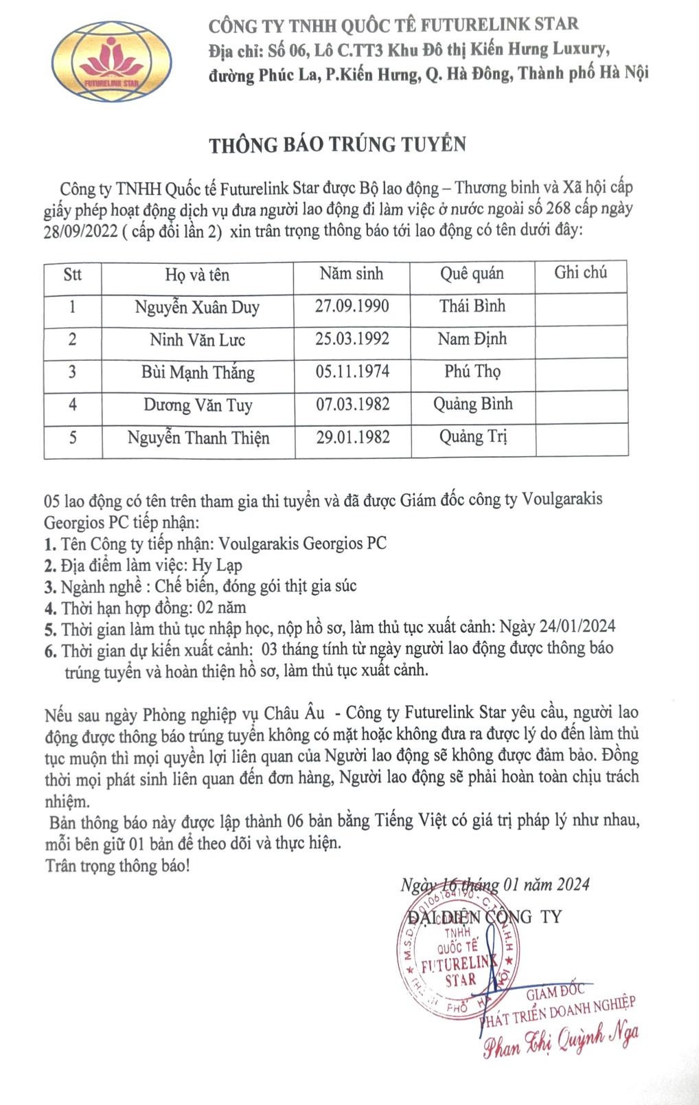 Tiếp nối thành công đoàn 1 xin chúc mừng 05 lao động tiếp theo. Tiếp tục tuyển chọn 05 lao động nữa. Hãy đăng ký trực tiếp tại Web: futurelink.net.vn và fan page để nhận được nhiều ưu đãi.