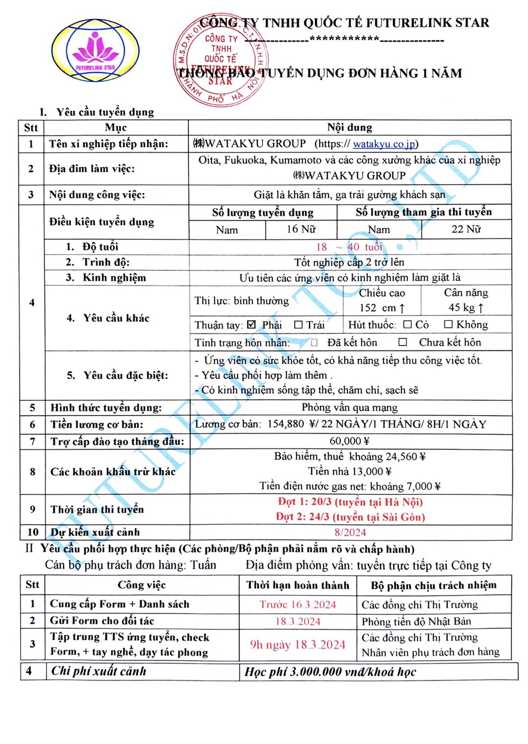 Futurelink Star tổng hợp đơn hàng đi XKLĐ Nhật Bản - Tháng 12.2025