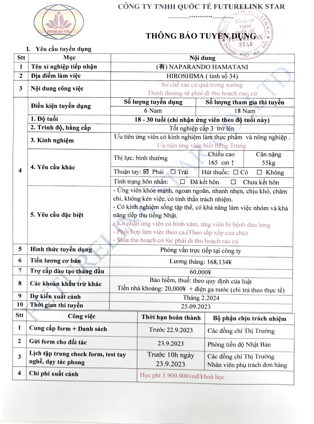 - TUYỂN 6 NAM SƠ CHẾ RAU CỦ QUẢ TRONG XƯỞNG TỈNH HIROSHIMA. LƯƠNG THÁNG 168,134 YÊN/THÁNG. PHỎNG VẤN 25.9