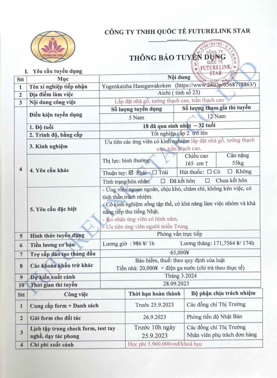 TUYỂN 01 QUẢN LÝ VÀ TRƯỞNG PHÒNG TIẾN ĐỘ XUẤT KHẨU LAO ĐỘNG ĐÀI LOAN