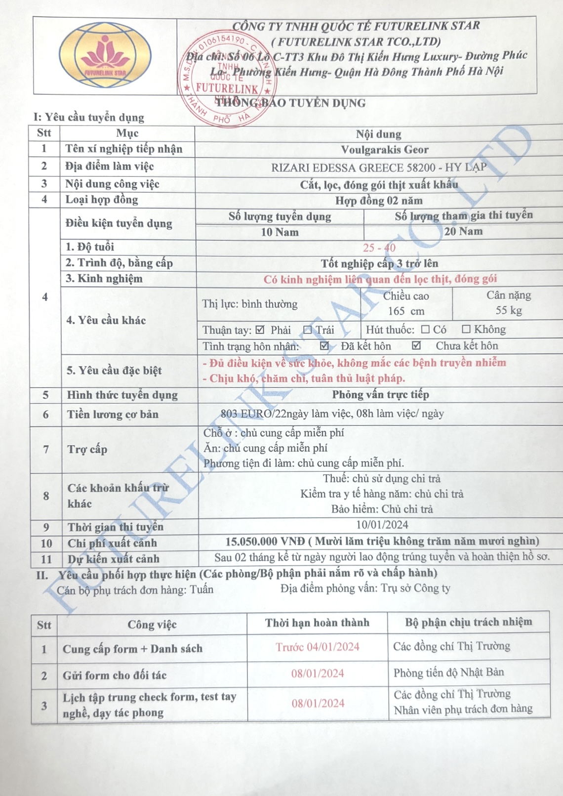Tuyển 10 nam cắt, lọc, đóng gói thịt xuất khẩu làm việc tại Hy Lạp, lương giờ 803 Euro/22 ngày. 8h/ngày. phỏng vấn ngày 10.1.2024