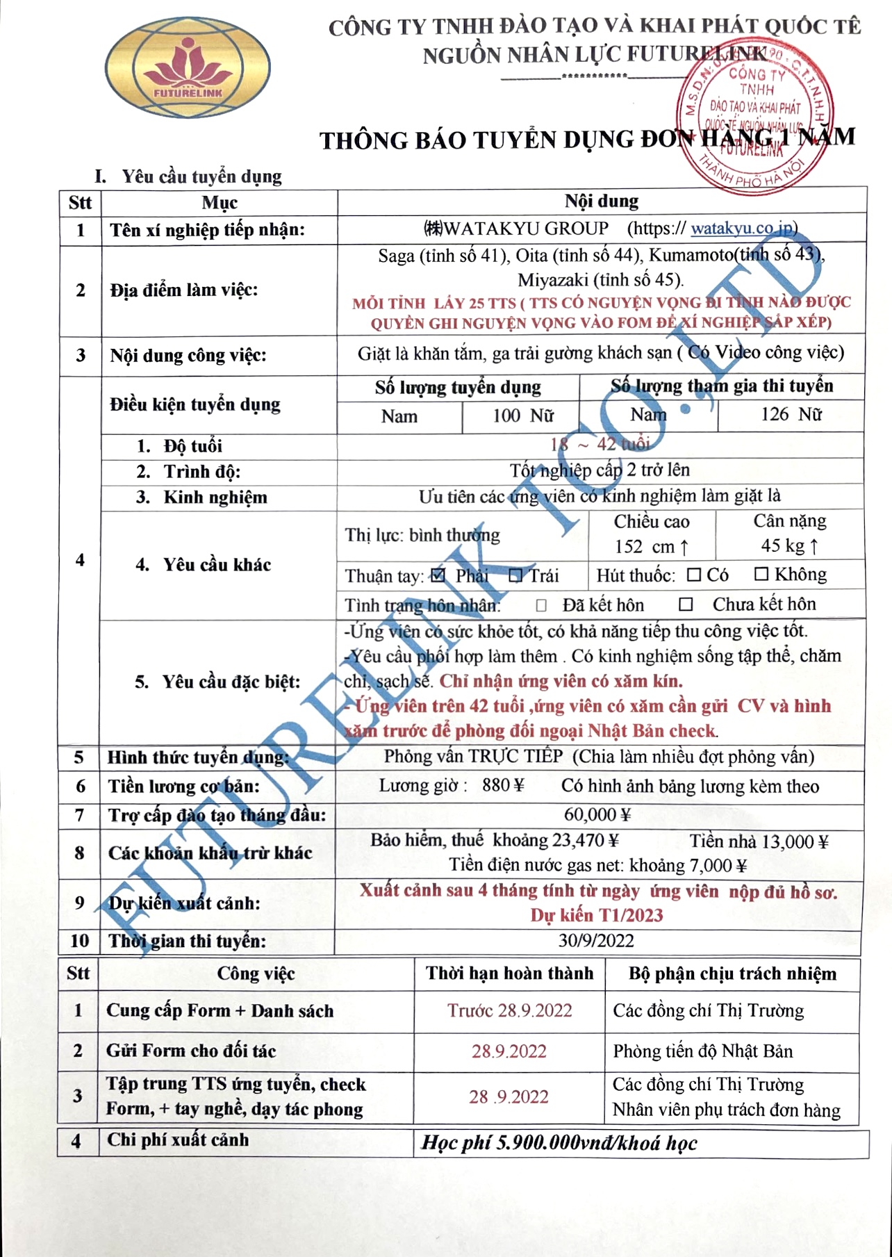 TUYỂN 100 NỮ GIẶT LÀ 1 NĂM. TỈNH SAGA, OITA, KUMAMOTO, MIYAZAKI. ĐỘ TUỔI TỪ 18-42, LƯƠNG THỰC LĨNH TỪ 16-18 MAN/THÁNG. PHỎNG VẤN 30/9