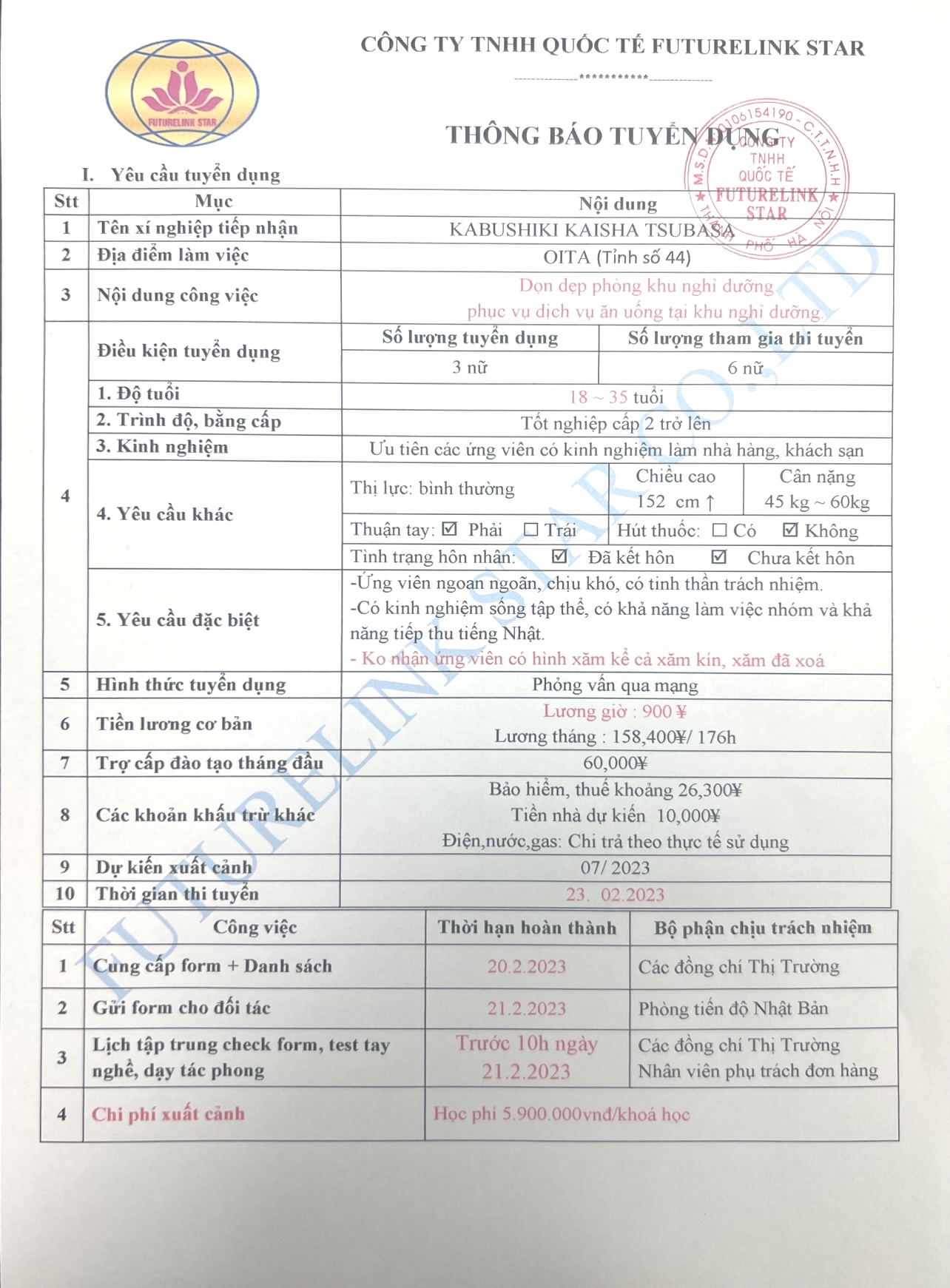 1.TUYỂN 3 NỮ DỌN DẸP PHÒNG KHÁCH TỈNH OITA, LƯƠNG THÁNG 158,400 YÊN/THÁNG(CHƯA TÍNH LÀM THÊM). PHỎNG VẤN 23.2.2023