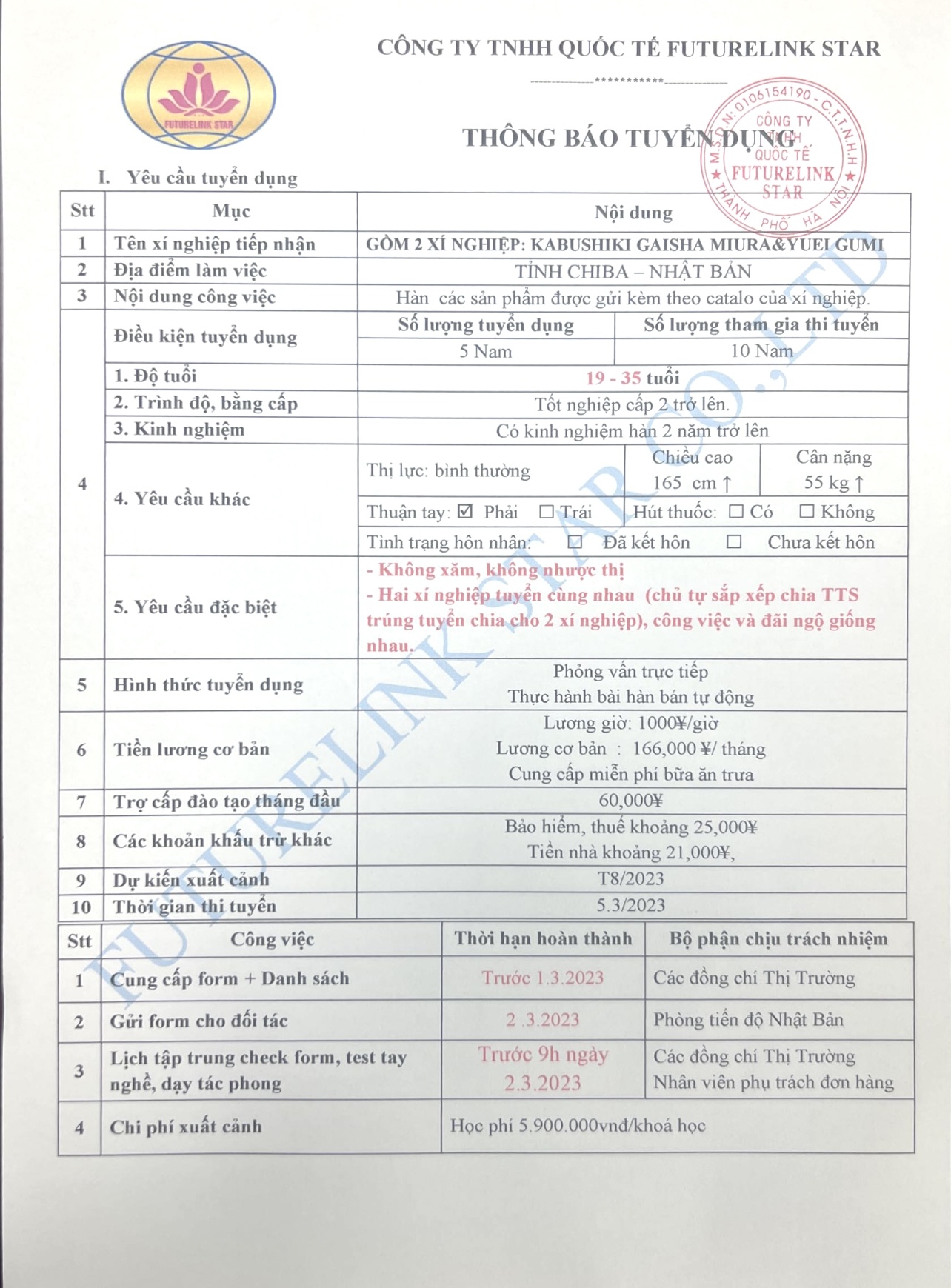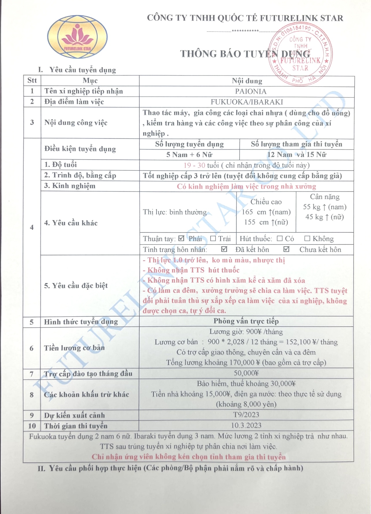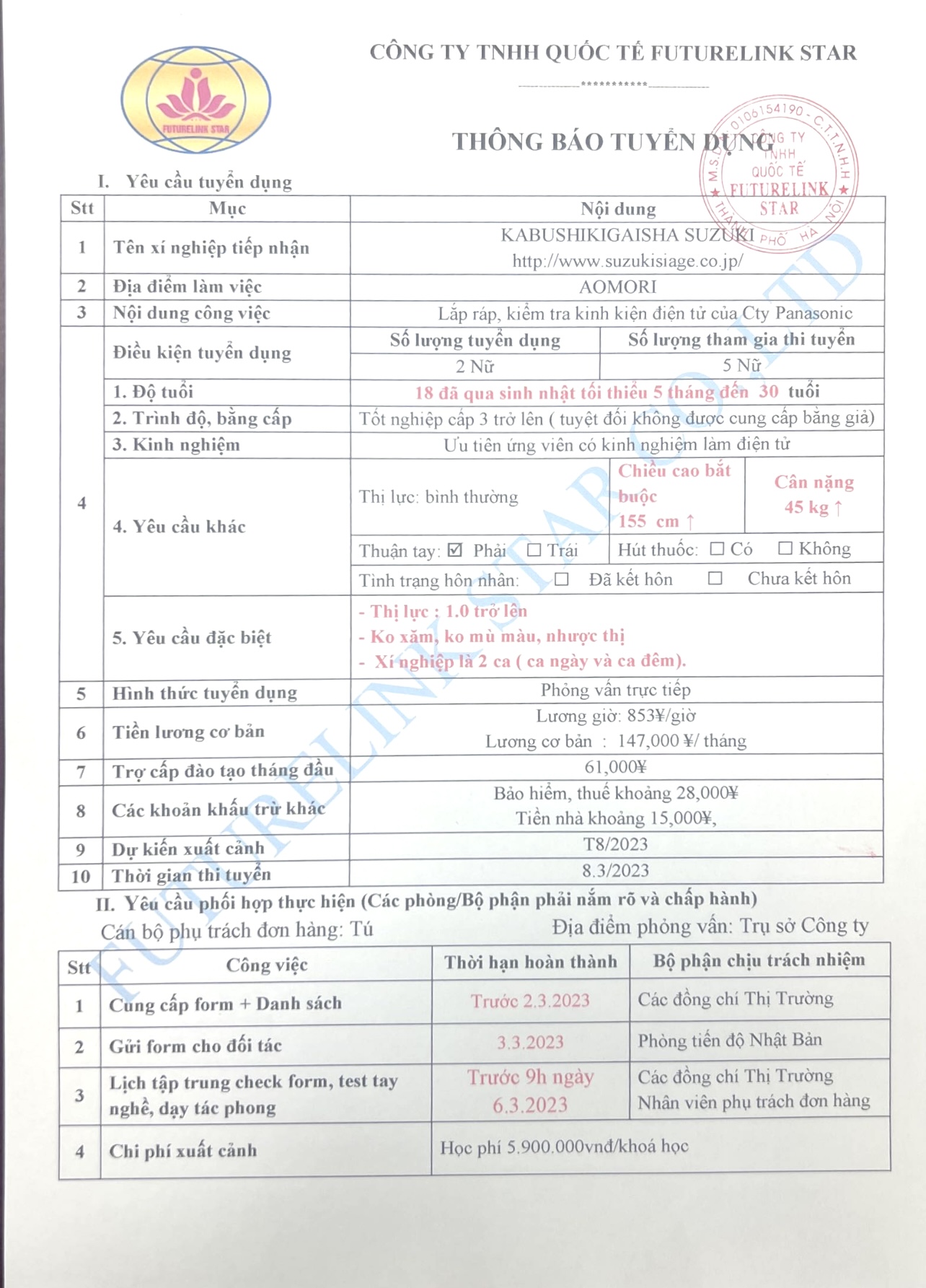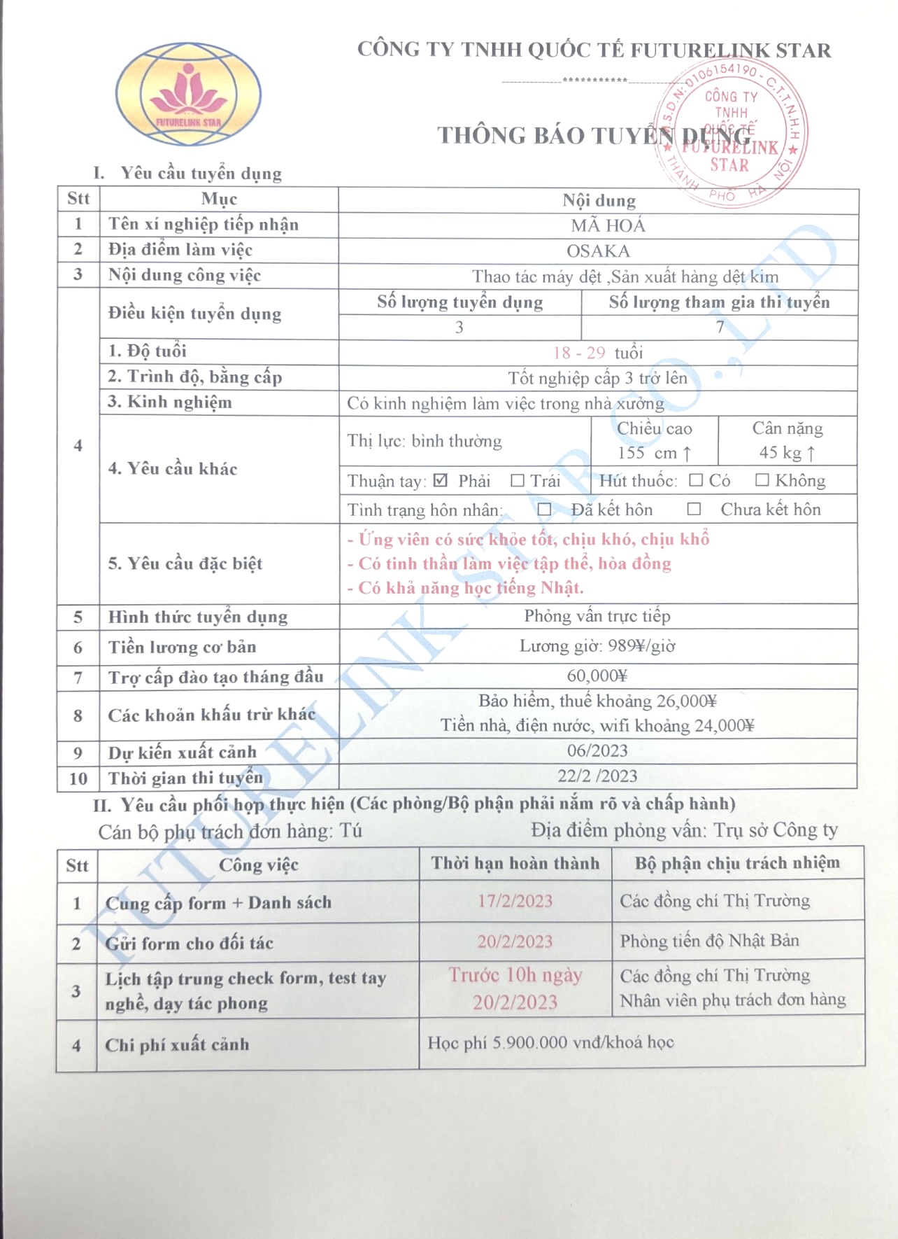 LƯƠNG THÁNG 147,000 YÊN/THÁNG(CHƯA TÍNH LÀM THÊM). PHỎNG VẤN 8.3.2023
