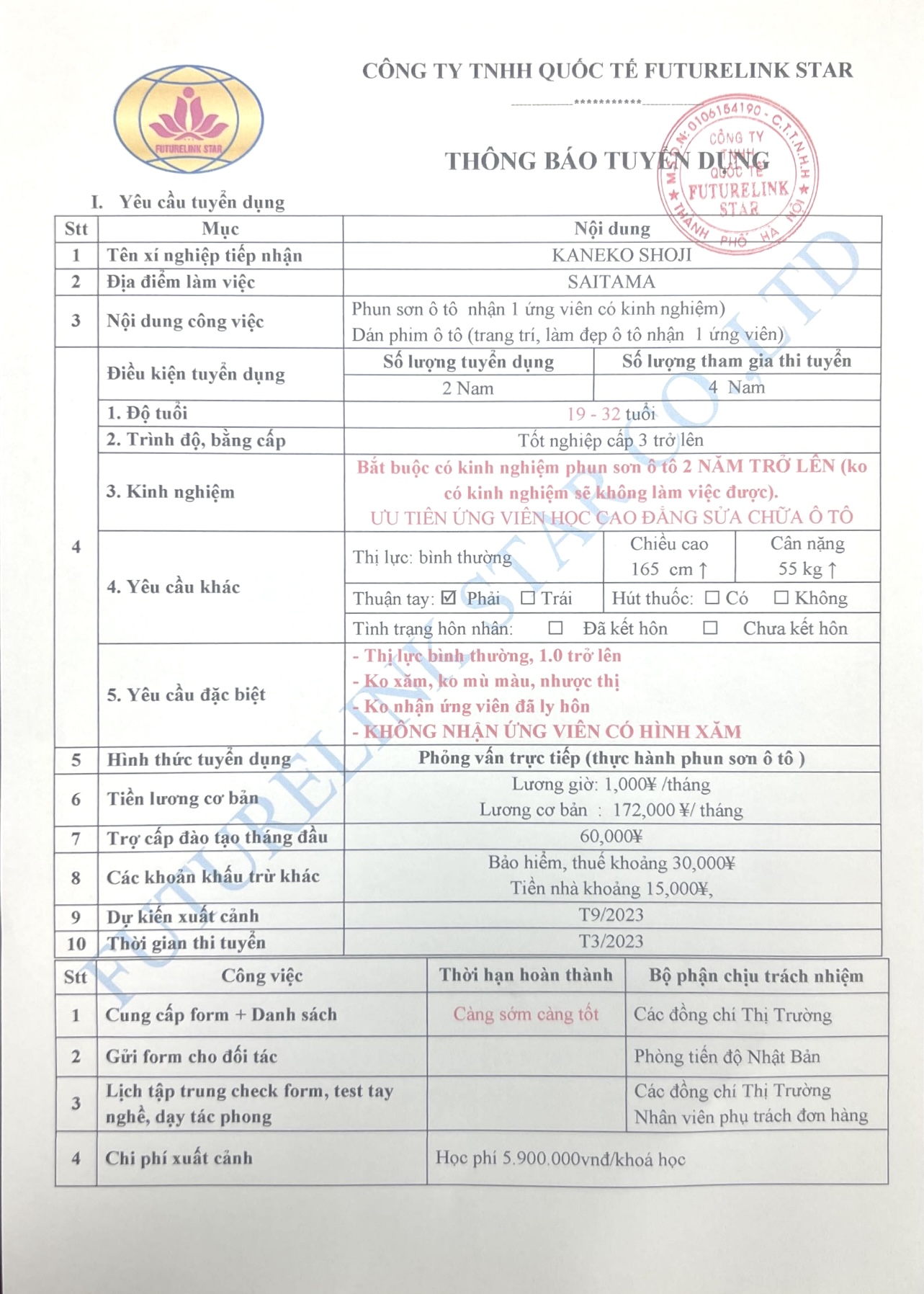 6.TUYỂN 2 NAM SƠN Ô TÔ TỈNH SAITAMA, LƯƠNG CƠ BẢN 172,000 YÊN /THÁNG. PHỎNG VẤN NGAY SAU KHI ĐỦ ỨNG VIÊN